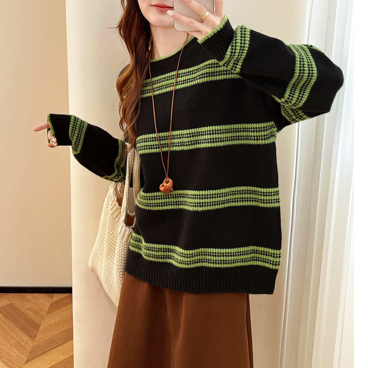 509081 围脖飘带简约V领宽松上衣女装 三福套头毛衣女2025新款 冬季