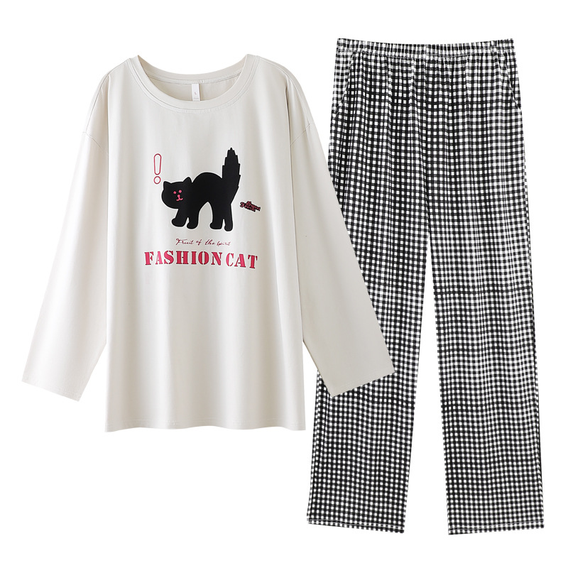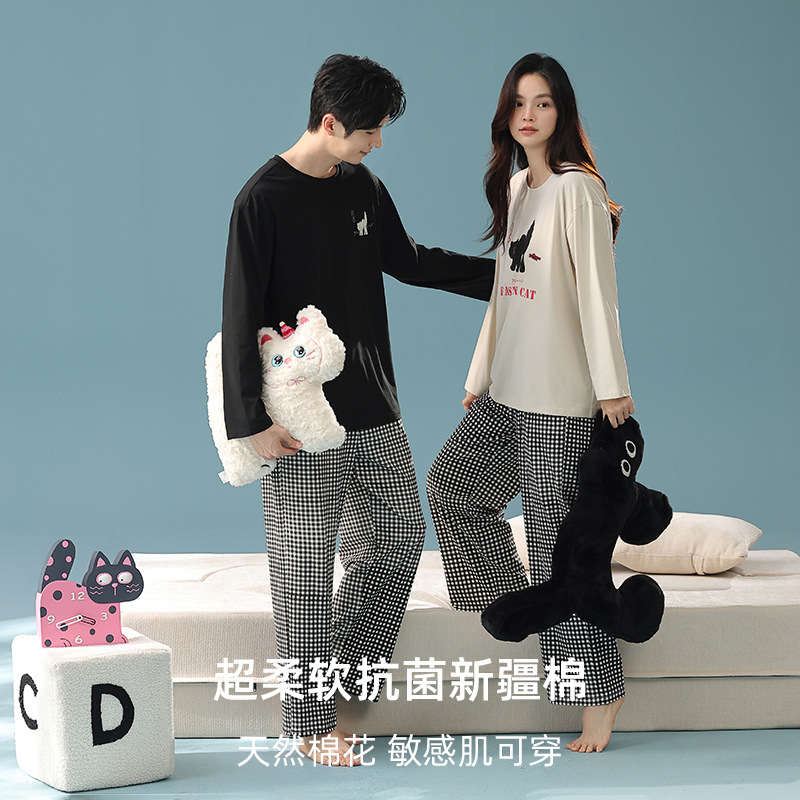 纯棉家居服套装 情侣睡衣黑白格纹长裤 猫咪长袖 OLAIF抗菌棉秋季
