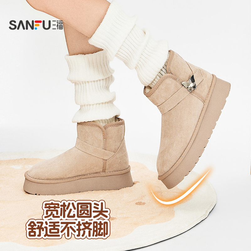女鞋 简约蝴蝶扣保暖加绒厚底棉鞋 832761 经典 三福雪地靴女冬季