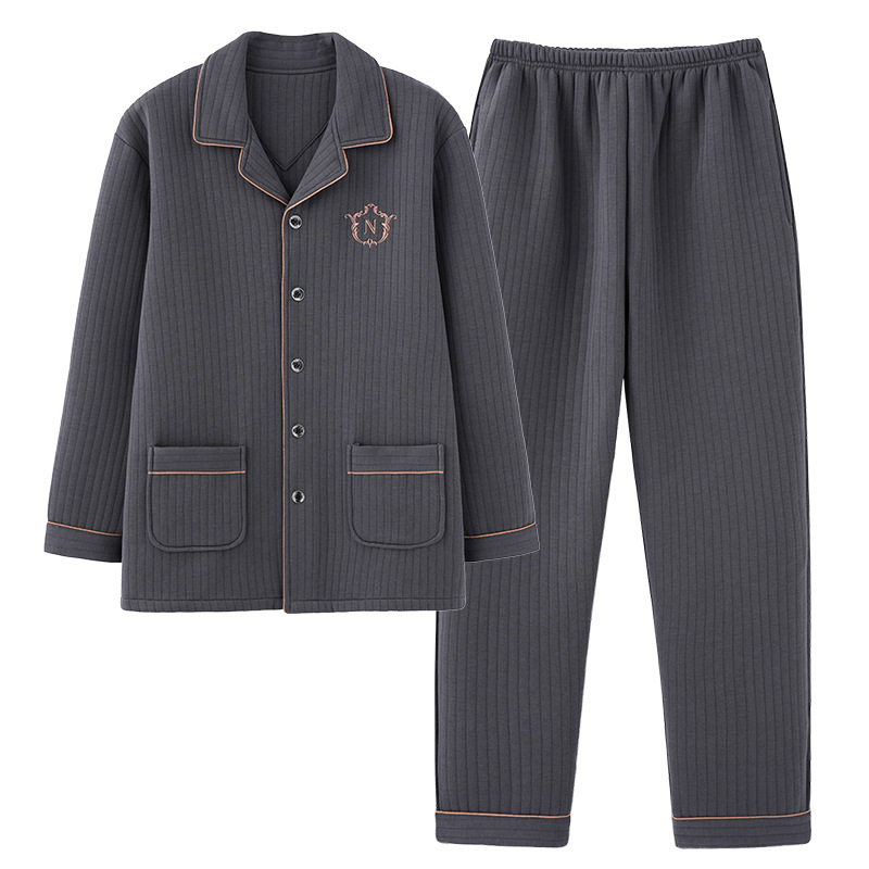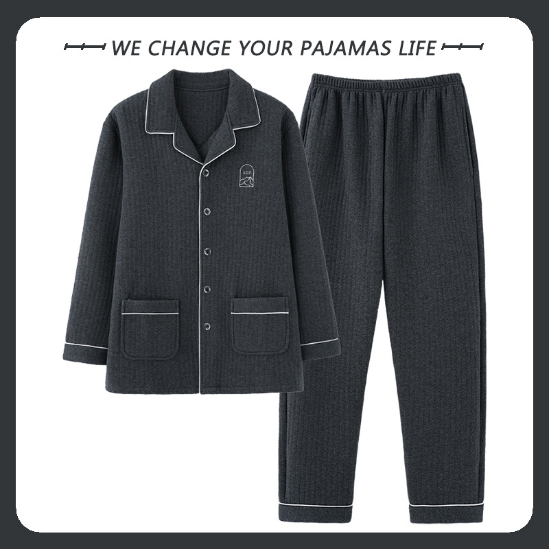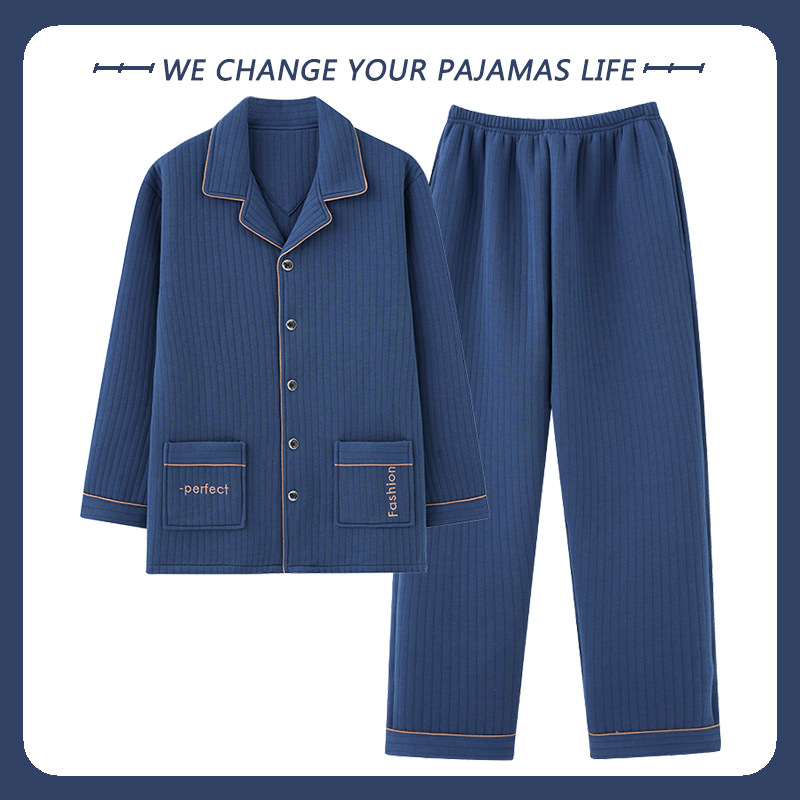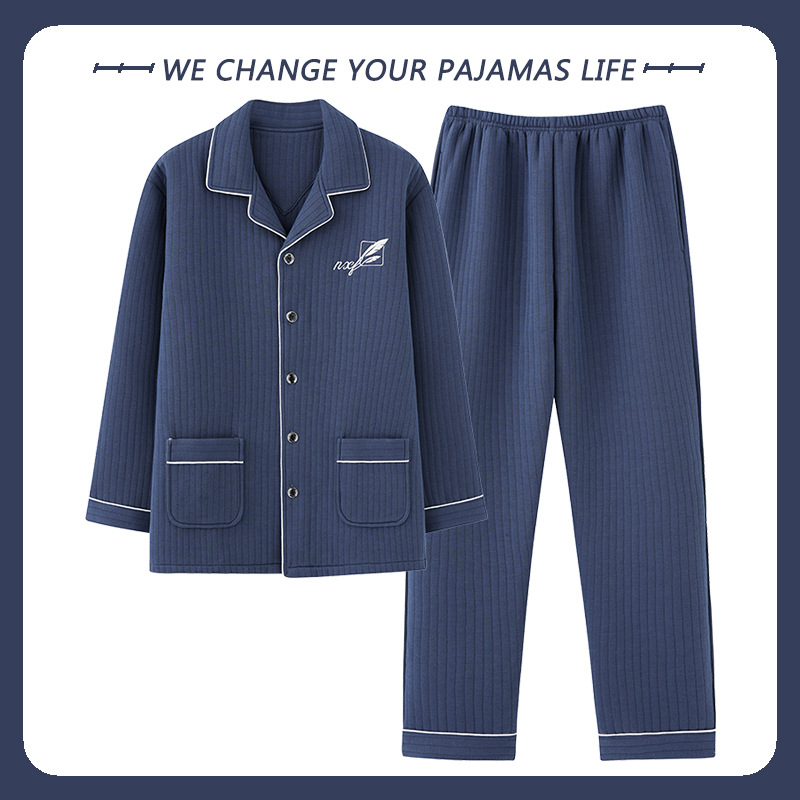 家居服秋冬季 男士 纯棉加厚青少年加大码 长袖 空气棉夹层睡衣秋冬季