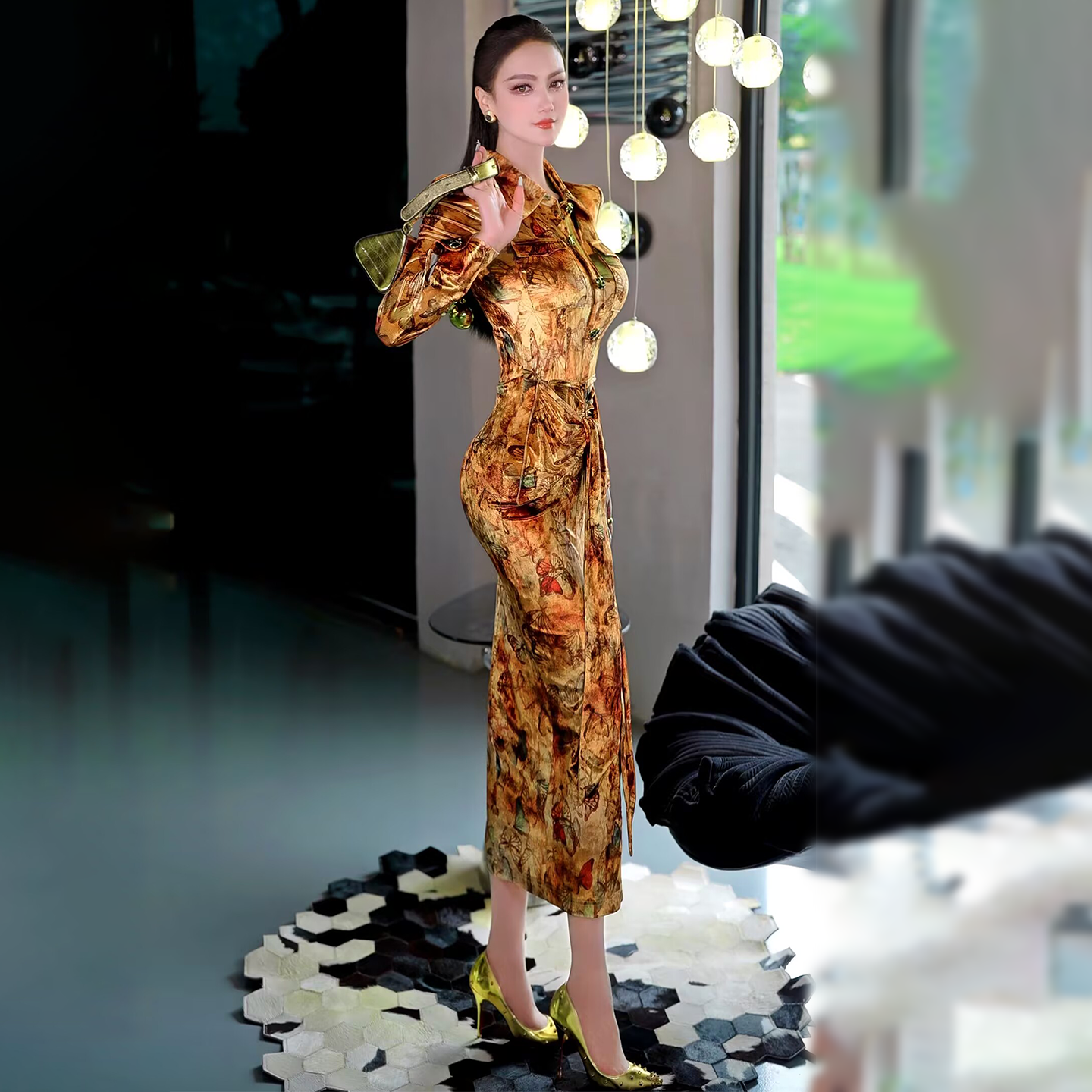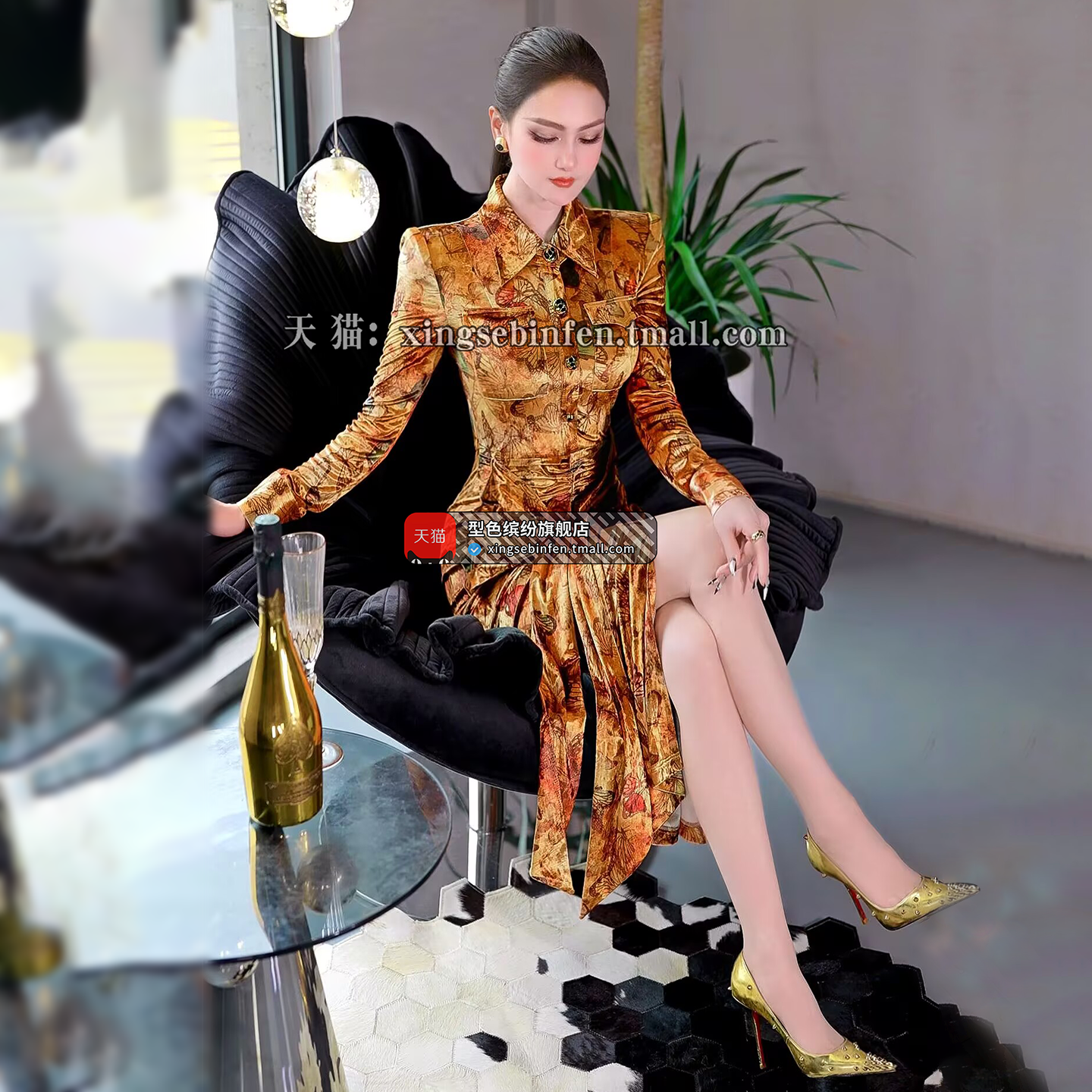 时尚 裙2025新款 收腰绑带开衩连衣裙 衬衫 初秋提花丝绒欧美中长款
