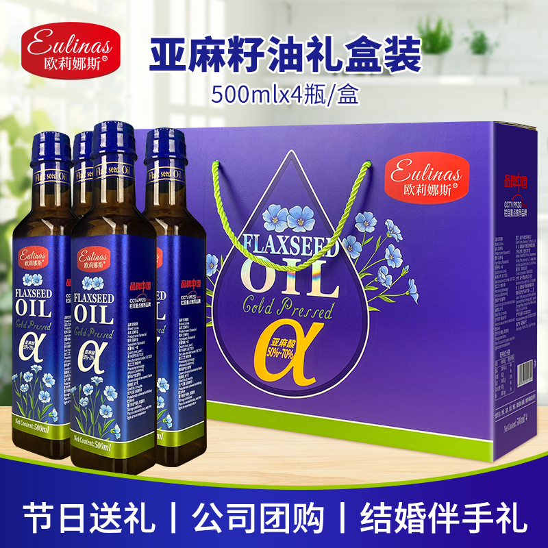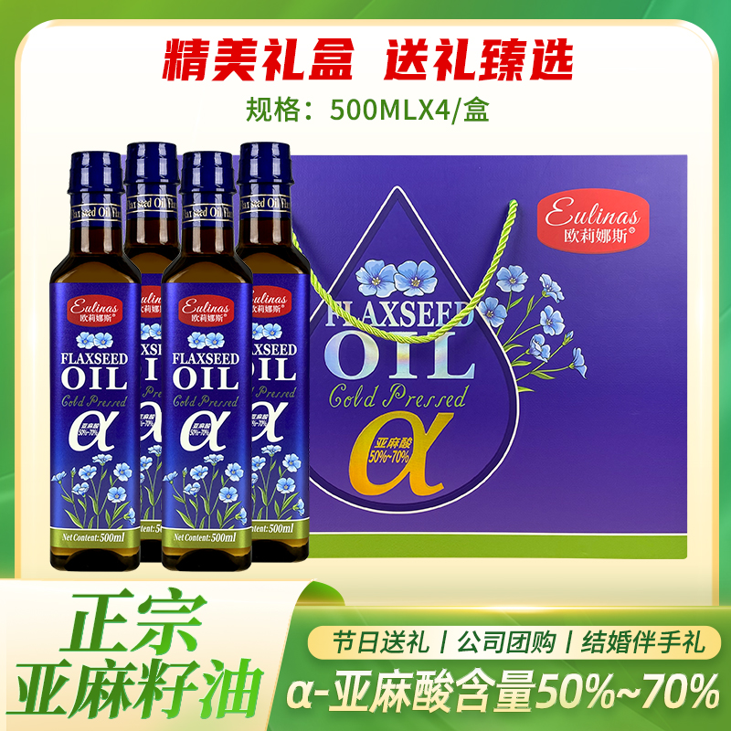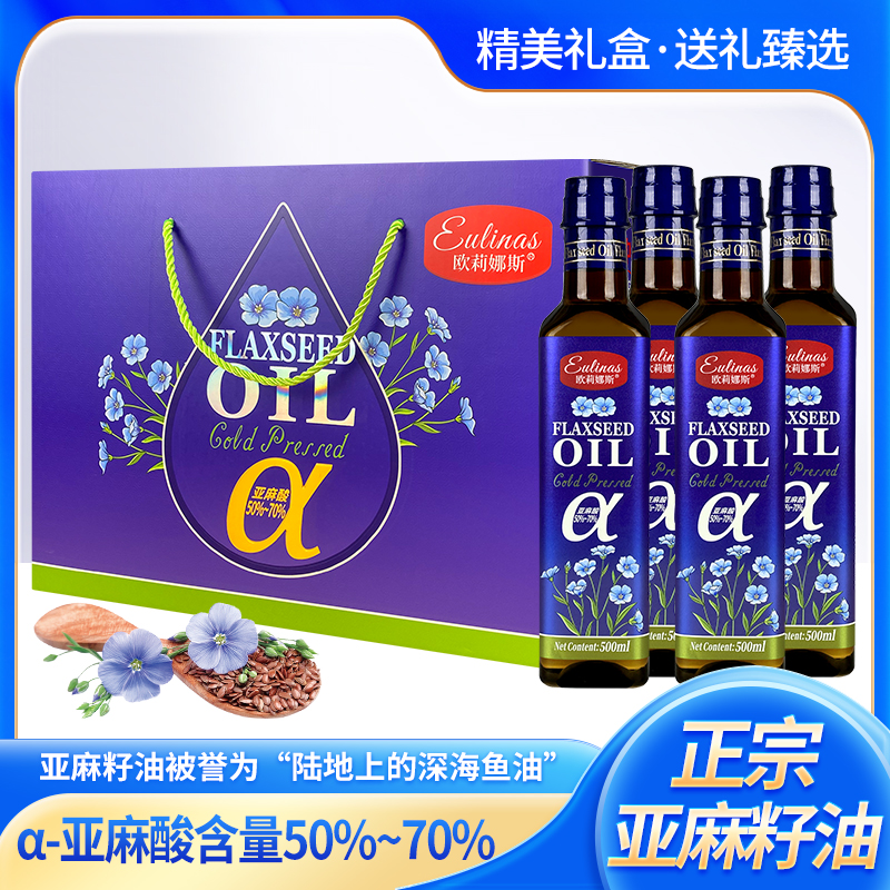 健康好油送礼好物 冷榨一级亚麻籽油500mlx4瓶礼盒装 精品礼盒