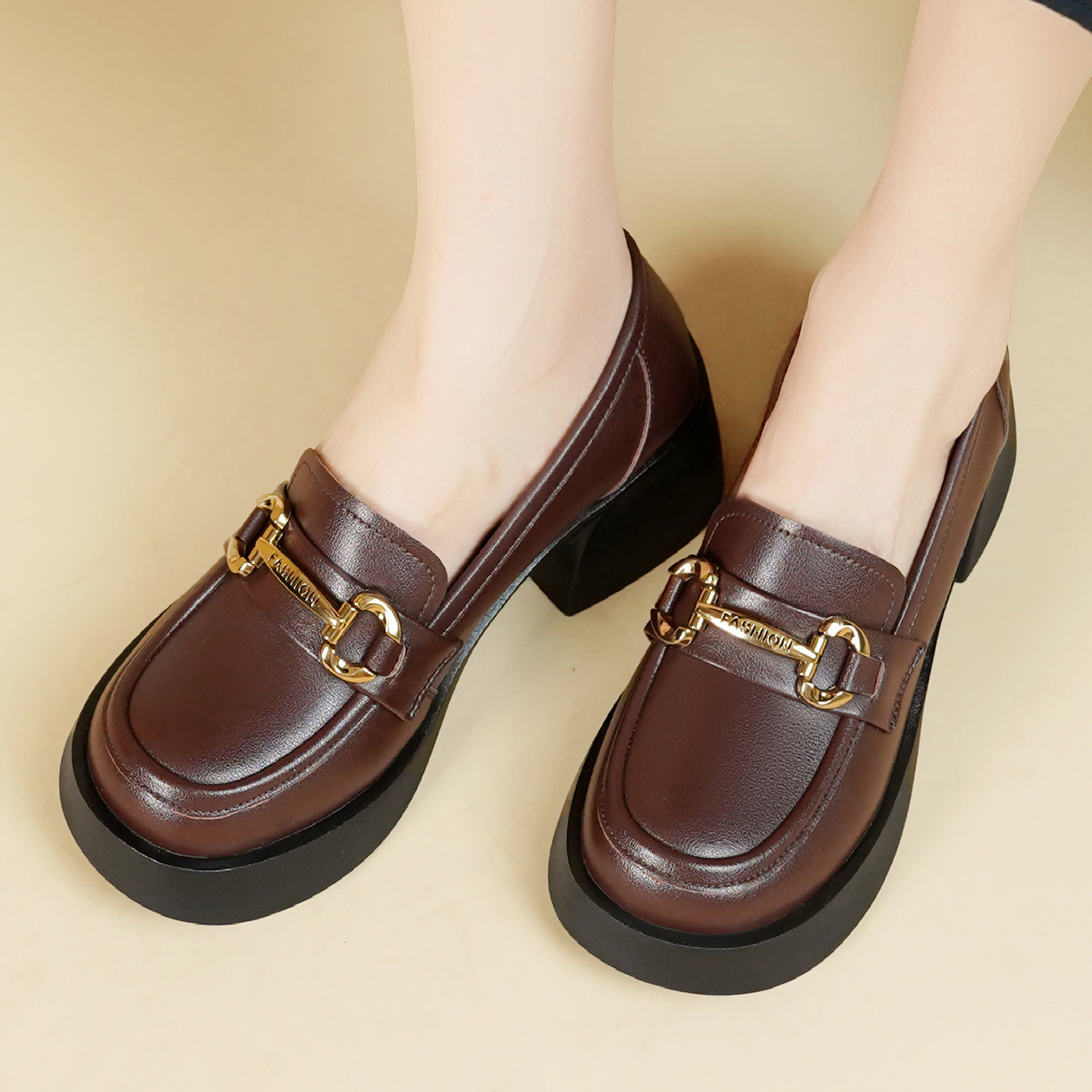 新款 康莉春季 高跟单鞋 女方头真皮通勤时尚 子 方扣浅口鞋 博主推荐