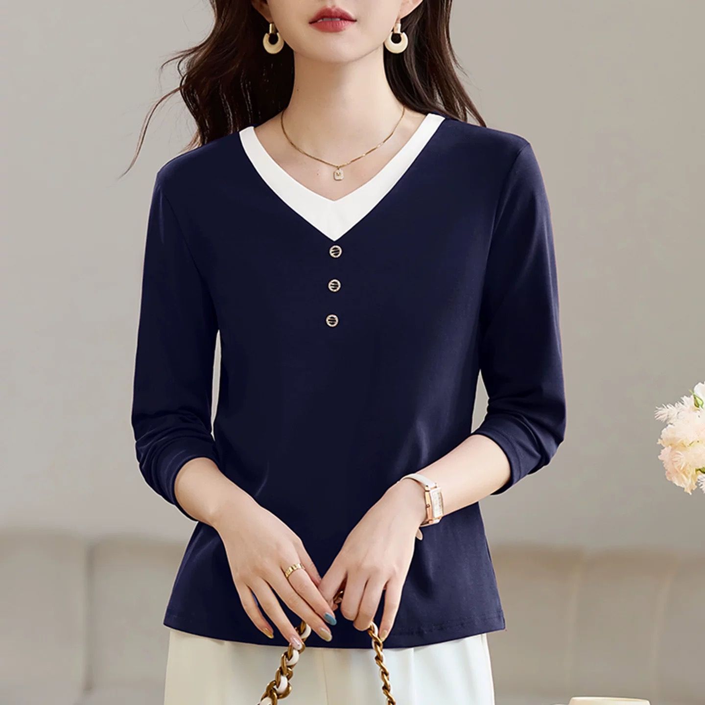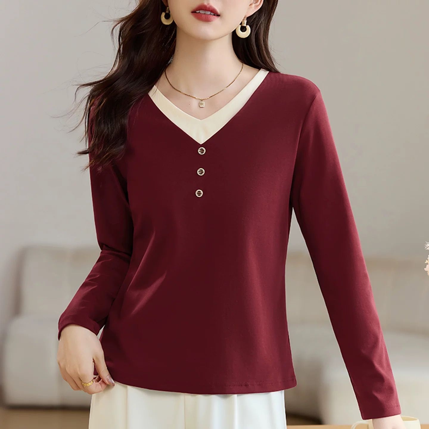 上衣气质显瘦打底衫 春秋季 假两件t恤女洋气减龄妈妈装 V领长袖 新款