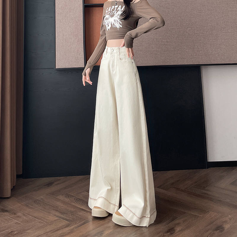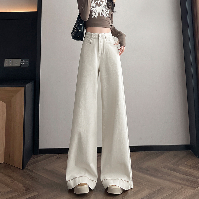 乔栈米白色高腰阔腿牛仔裤 女秋冬加绒小个子宽松显瘦垂感微喇拖地