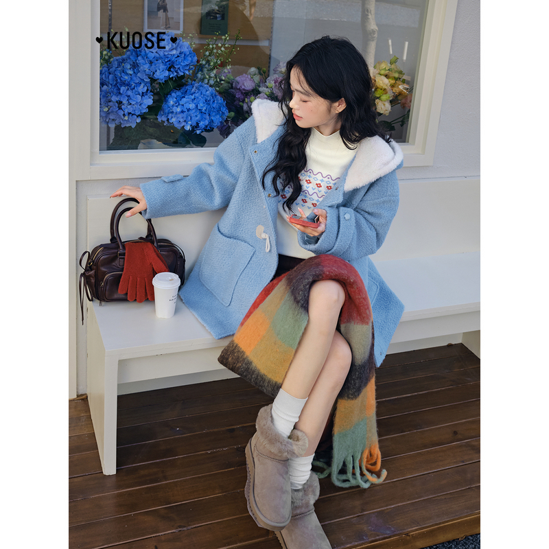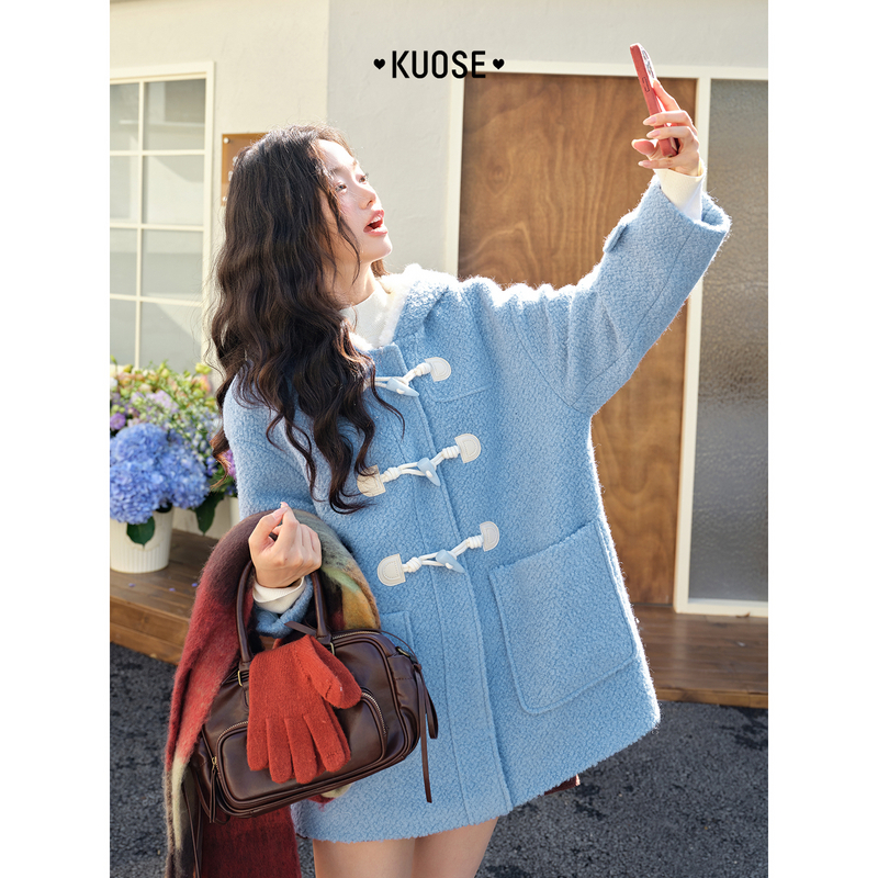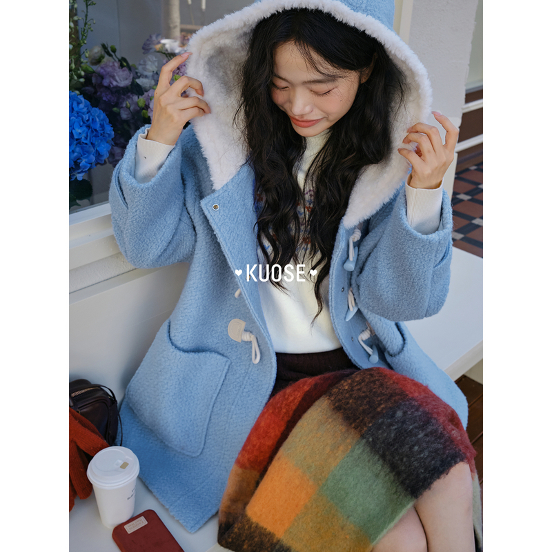 女装 加大码 秋冬赫本风连帽厚绵羊绒毛呢外套 韩版 呢子大衣女中长款