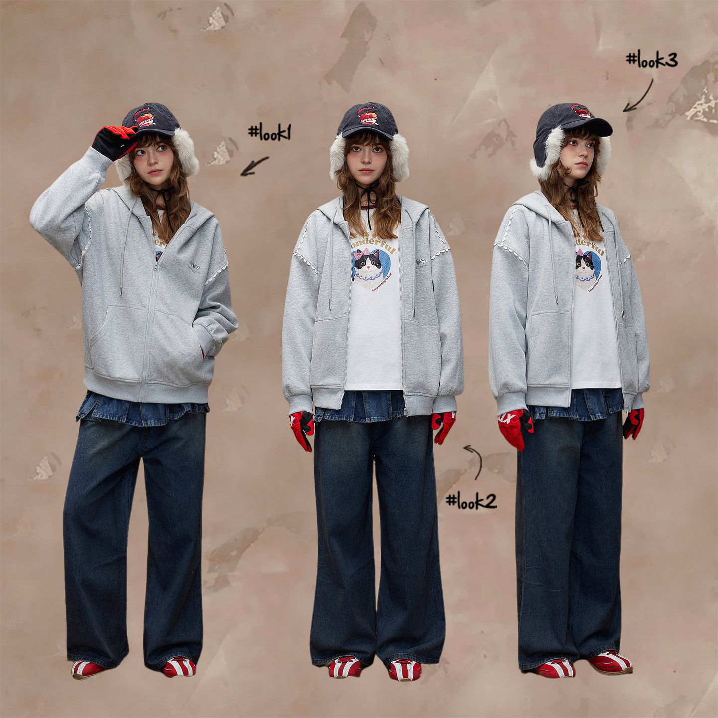 外套 针织外套女印花连帽灰色韩系慵懒风休闲开衫 唐狮2025秋季 新款