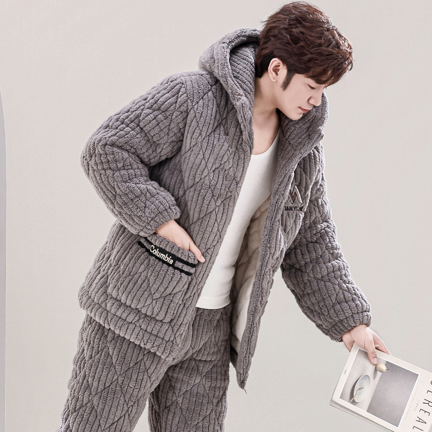 冬款 连帽款 三层珊瑚绒夹棉袄加厚加绒保暖家居服套装 睡衣冬季 男士