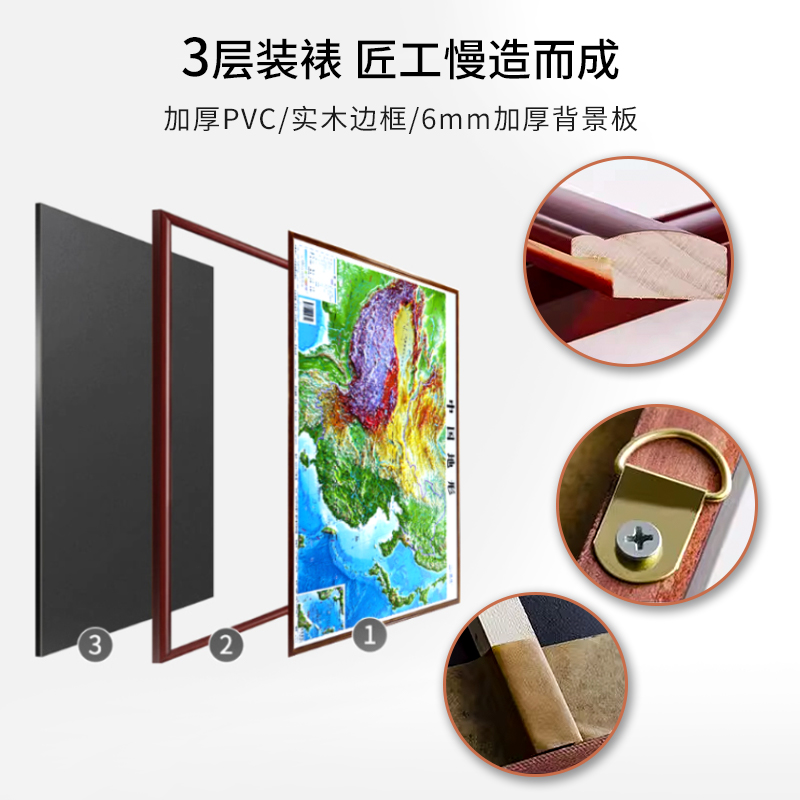 精雕3d立体地图实木边框 裱居家办公室背景墙装 中国地图和世界地图2025年新版 饰画三维地貌带框装 饰挂图 3D立体凹凸地形图高档装