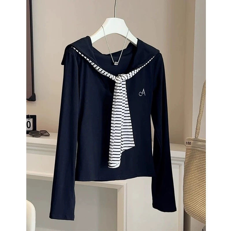 小上衣 设计感撞色条纹V领修身 韩系正肩条纹海军领长袖 上衣女秋季