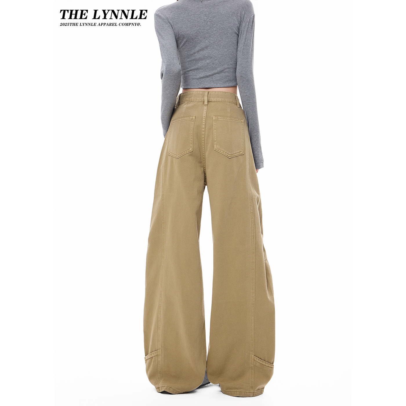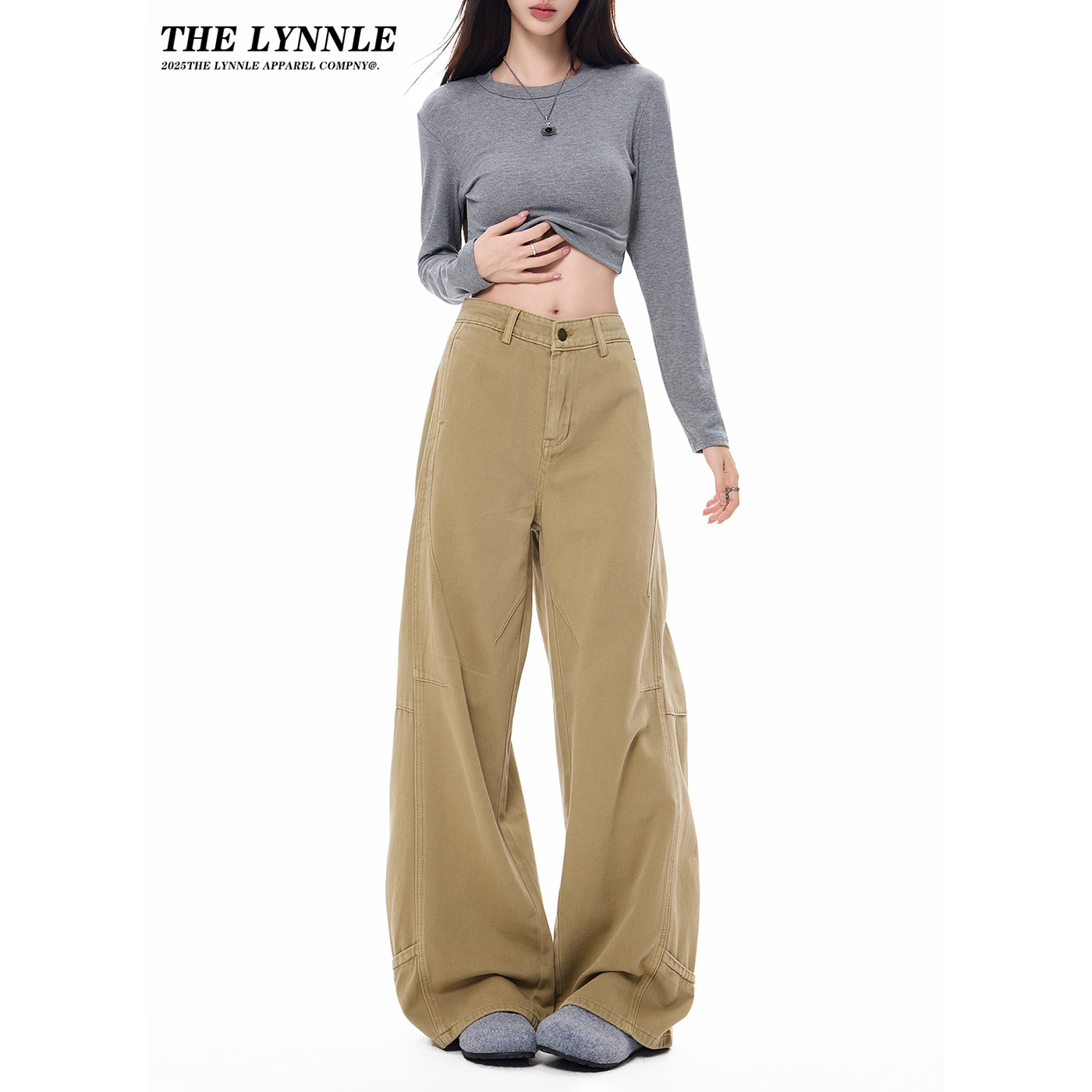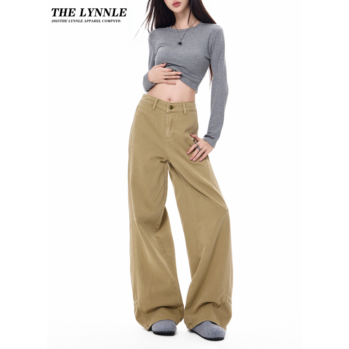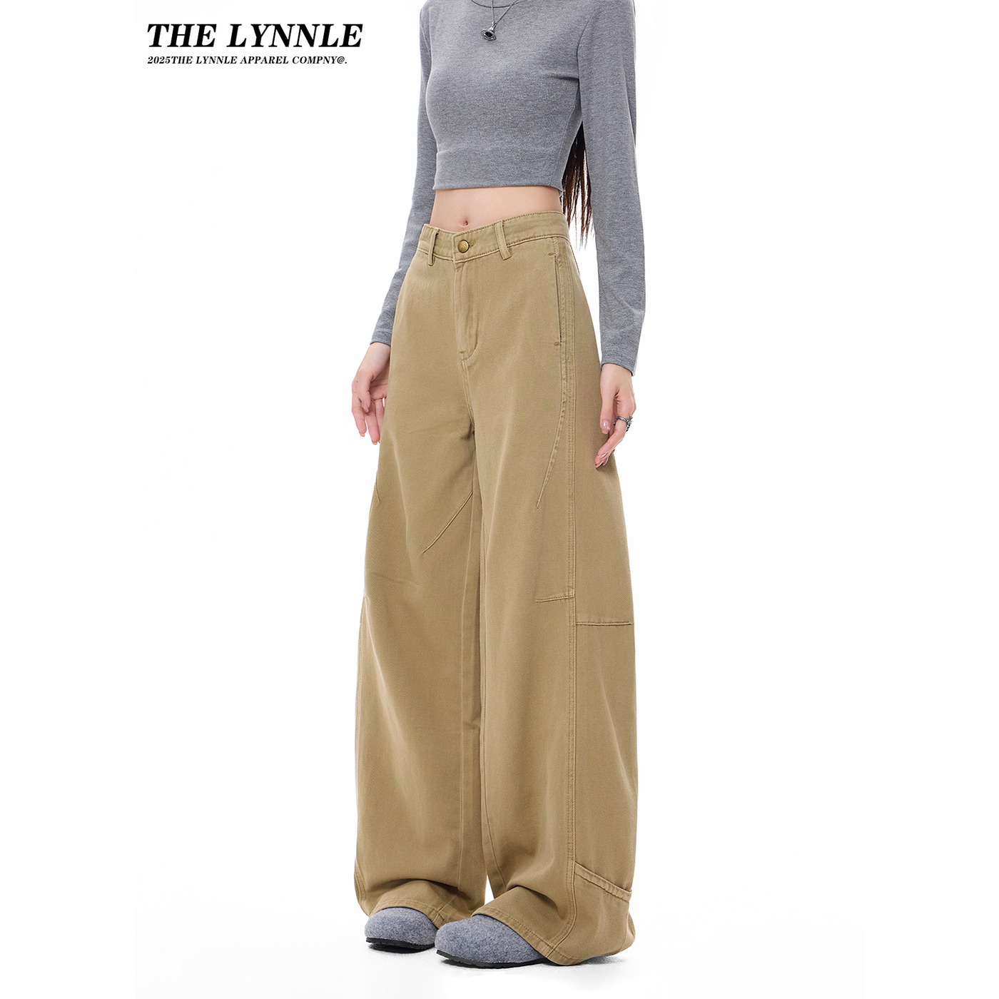 裤 THELYNNLE韩系卡其色裤 宽松直筒工装 显瘦阔腿牛仔裤 子女秋季