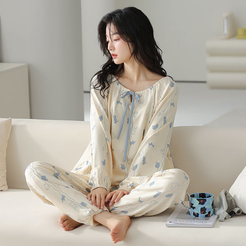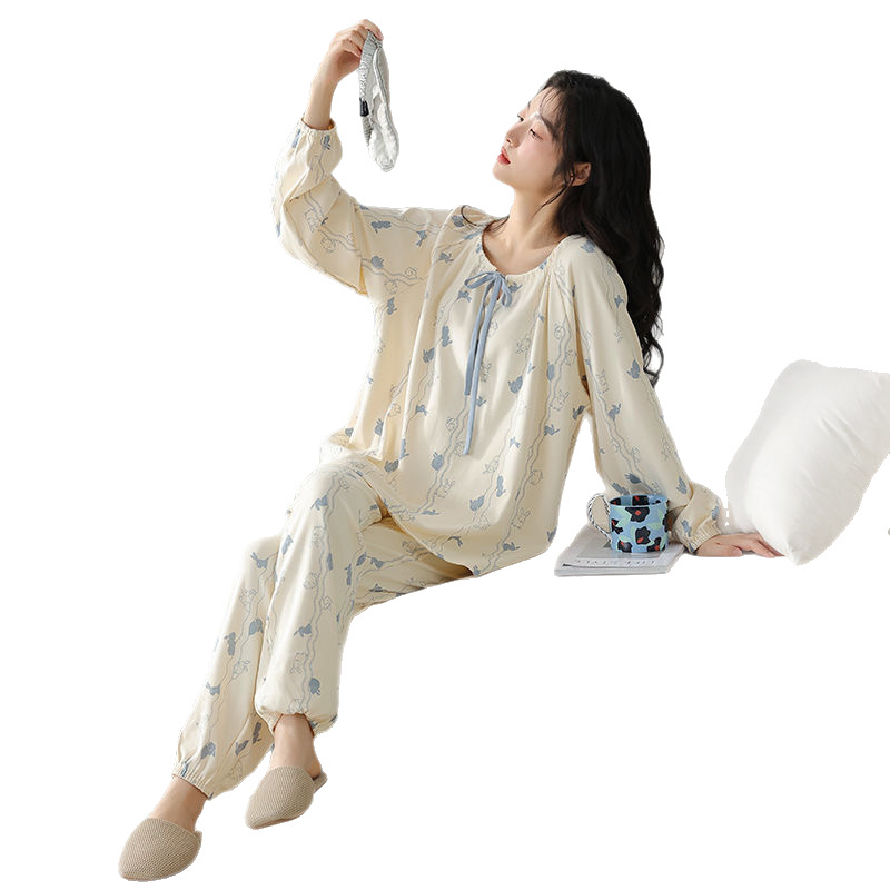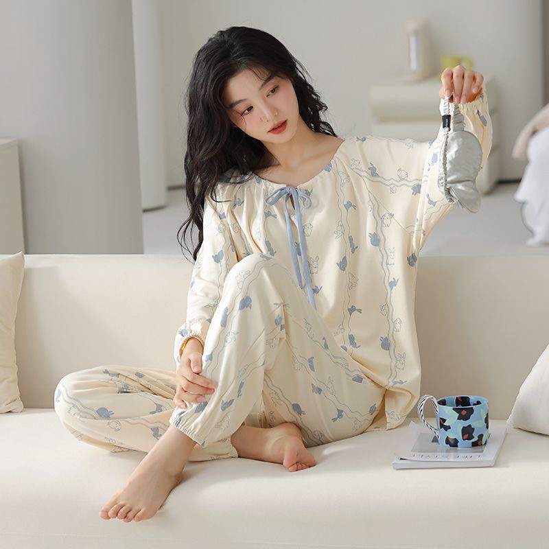 淑美休闲套装 睡衣女款 秋冬季 春秋天女长袖 家居服可外穿 带胸垫新款