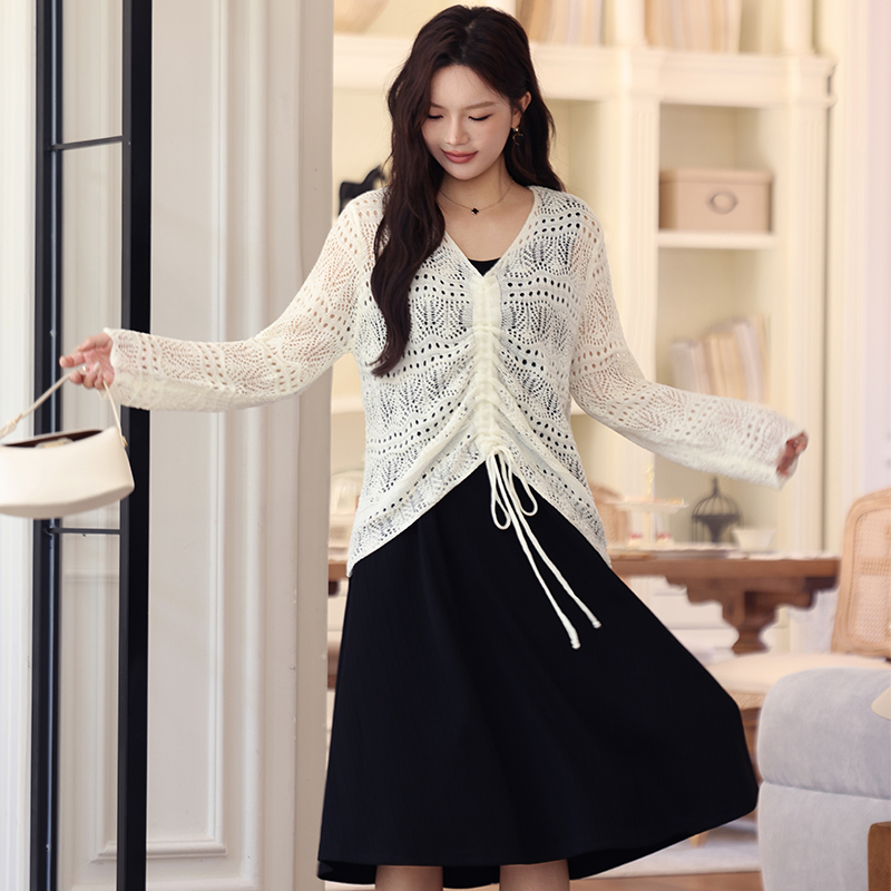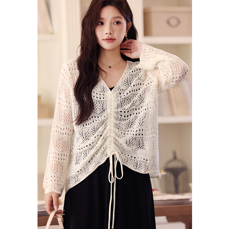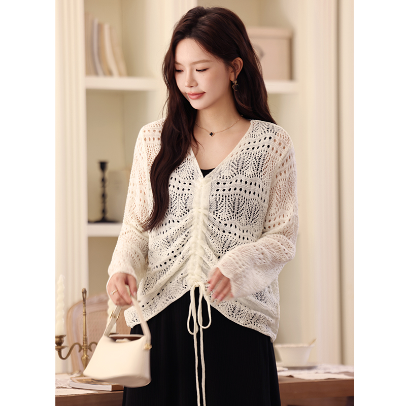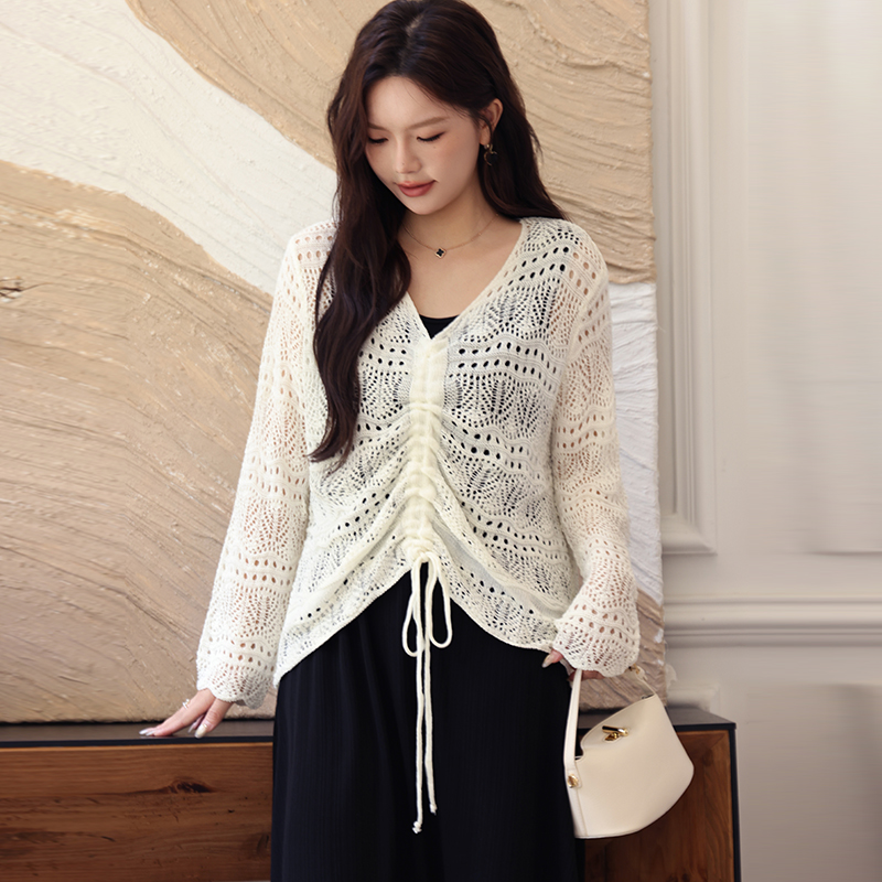V领气质宽松抽绳镂空长袖 新款 毛衣 显瘦胖MM上衣女秋季 绮娑大码