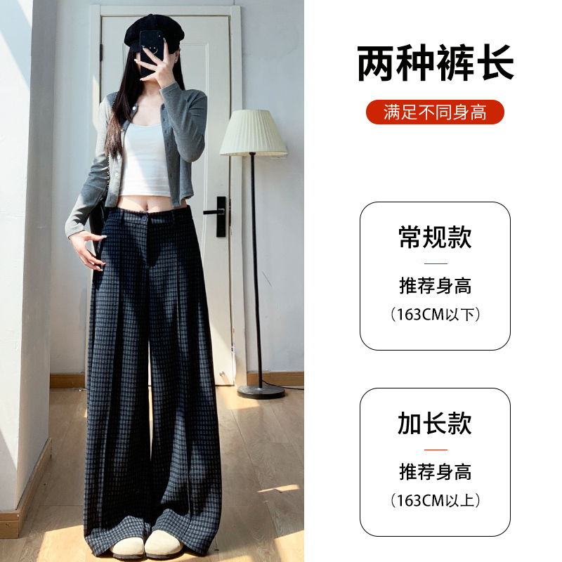 高腰显瘦垂感休闲小个子宽松阔腿裤 2025新款 女春秋季 藏青色格子裤