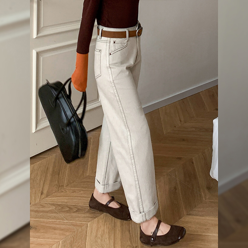 高腰显瘦百搭九分裤 白鹿语复古洗水撞色卷边直筒牛仔裤 25秋新款