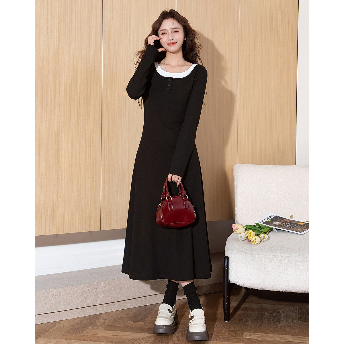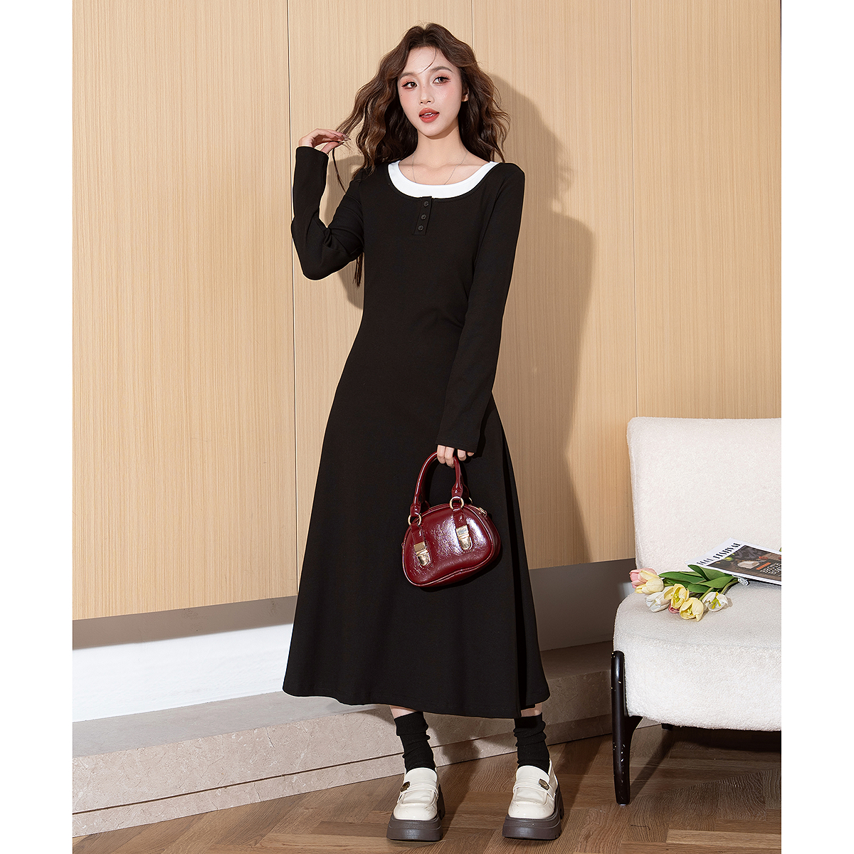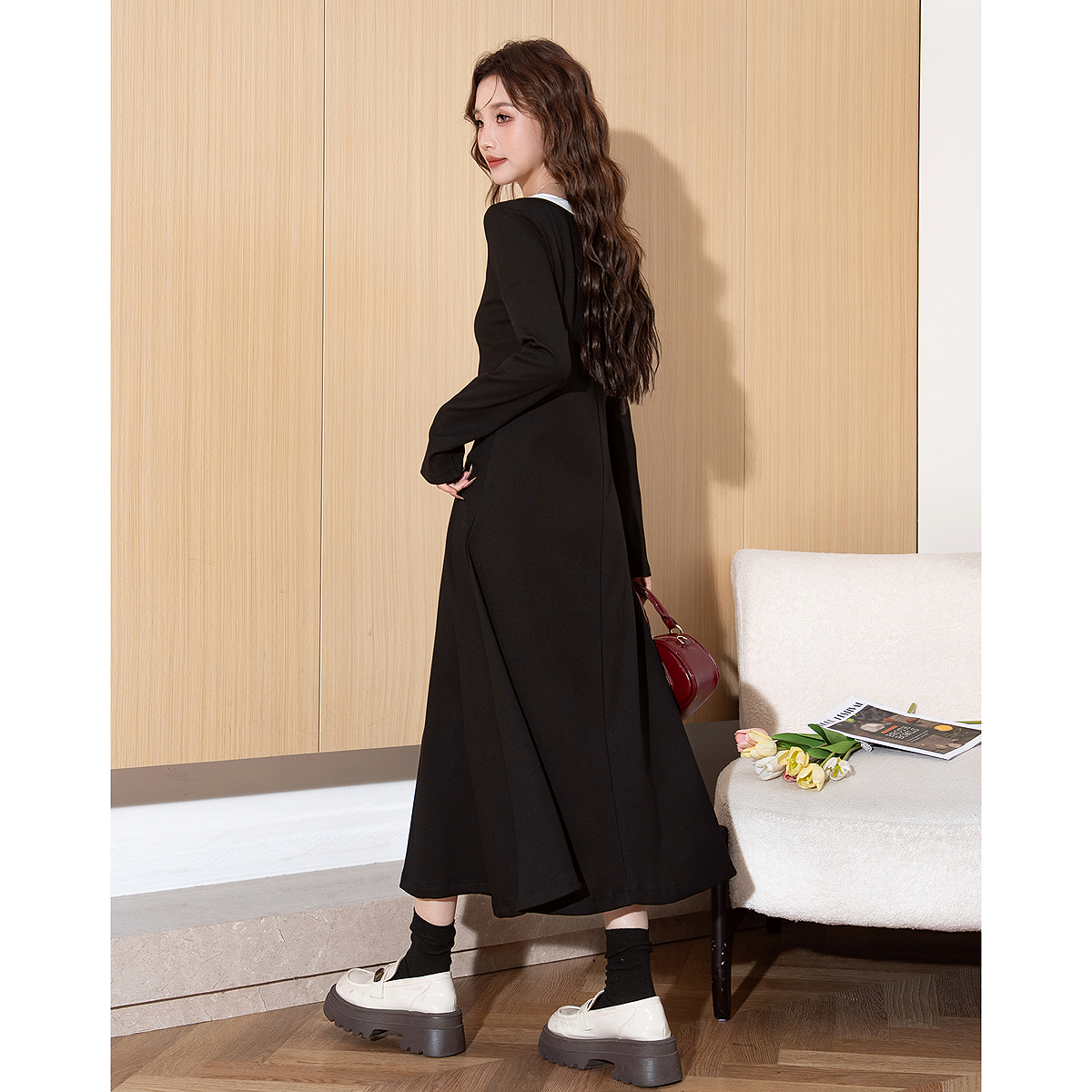 裙子高智感穿搭 紫红色长袖 赢智尚法式 小资连衣裙女2025秋冬新款
