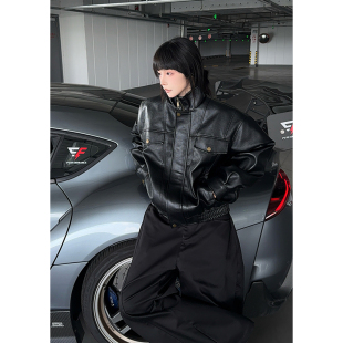 假两件贴贴复古皮衣女 秋新款 BJHG不计后果美式 bomber夹克外套男款
