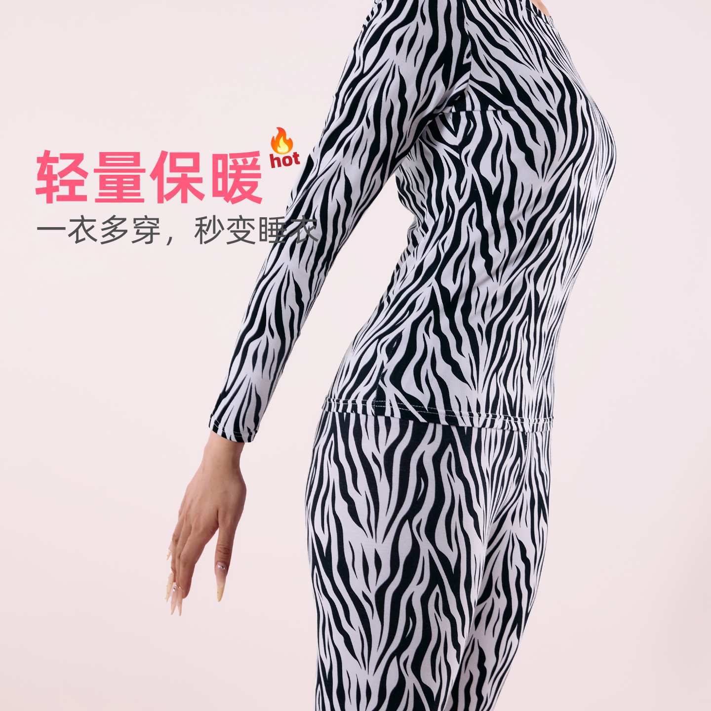 中腰收腹长裤 女士保暖套装 紧身大码 打底衫 斑马纹印花 纯棉秋衣秋裤