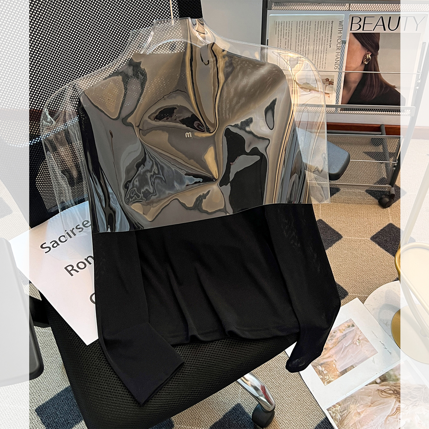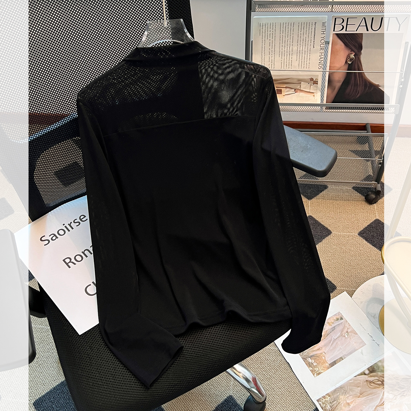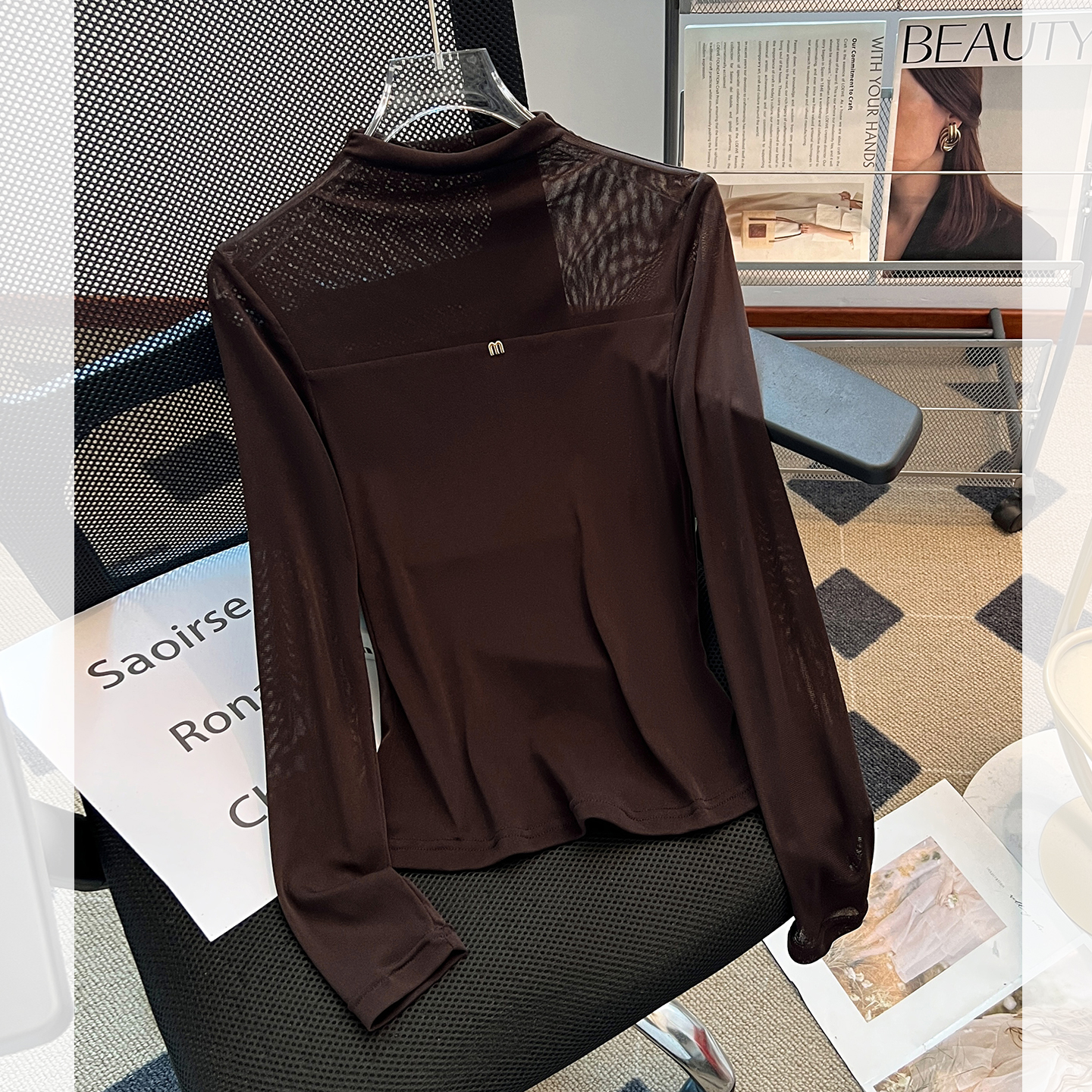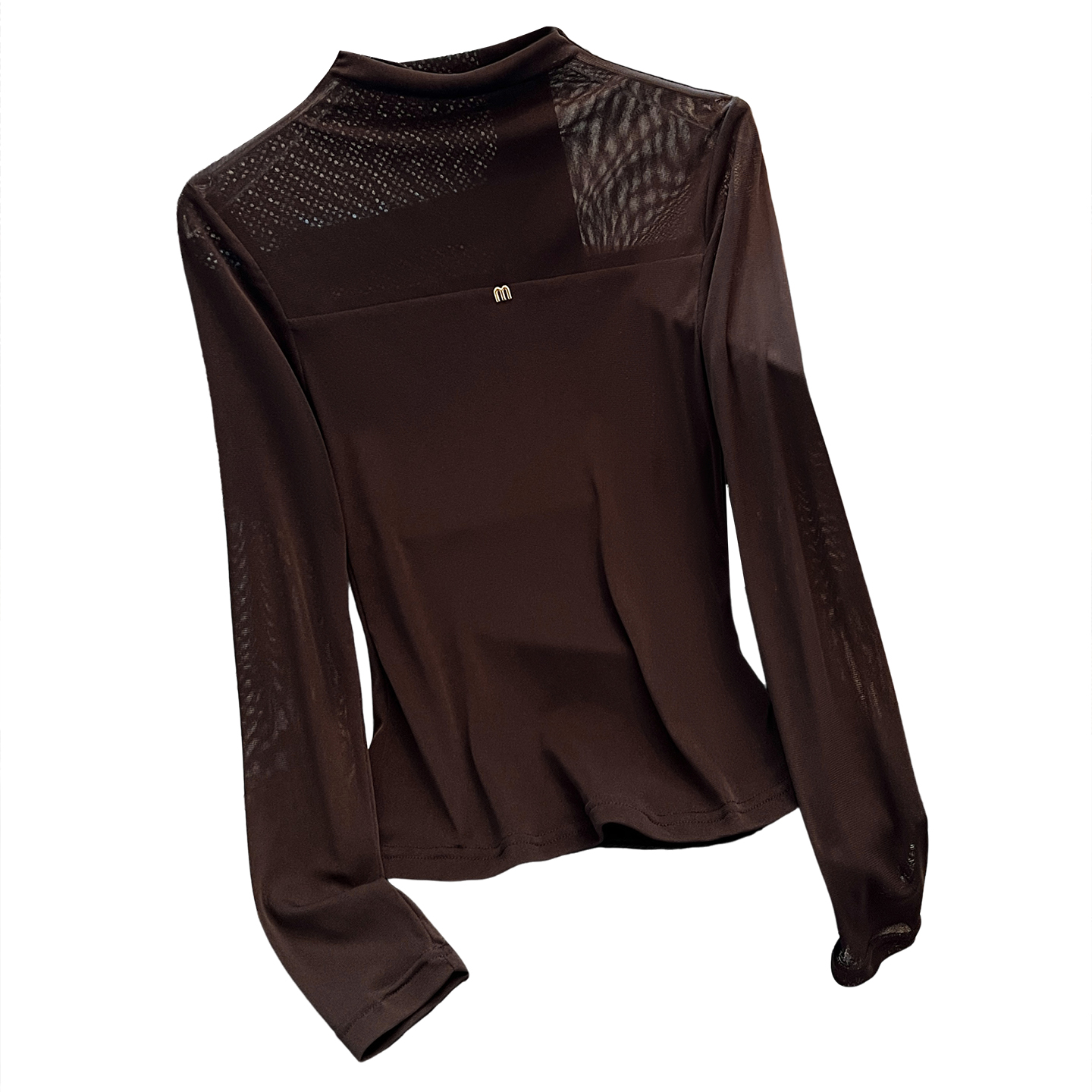 新款 女2025早秋季 超好看单穿上衣服 t恤打底衫 拼接网纱半高领长袖