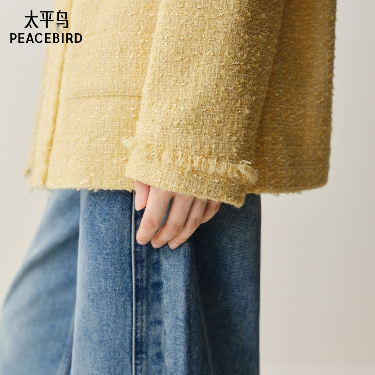 太平鸟绗棉小香风肌理外套箱型显瘦5%羊毛夹棉毛边小香风短外套女