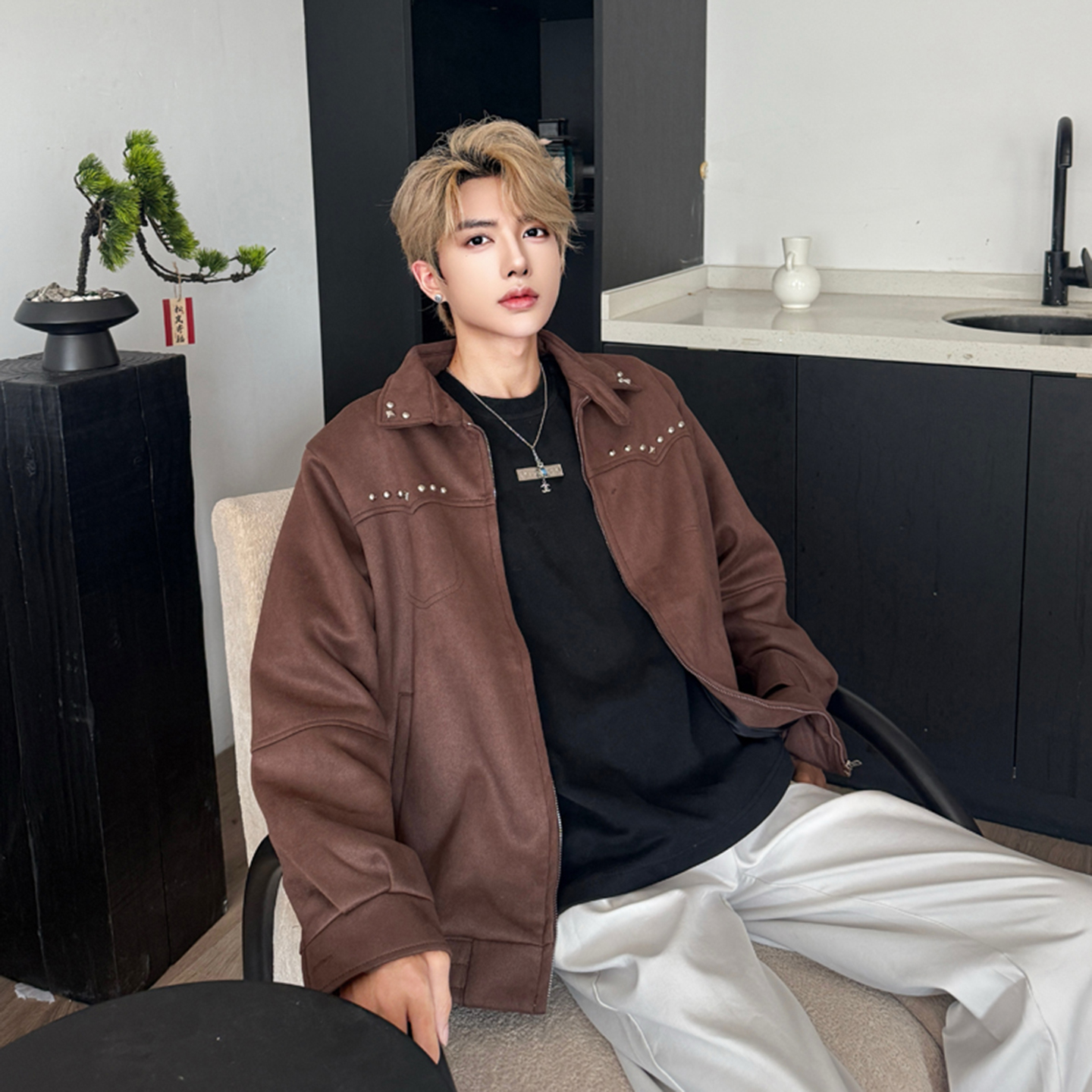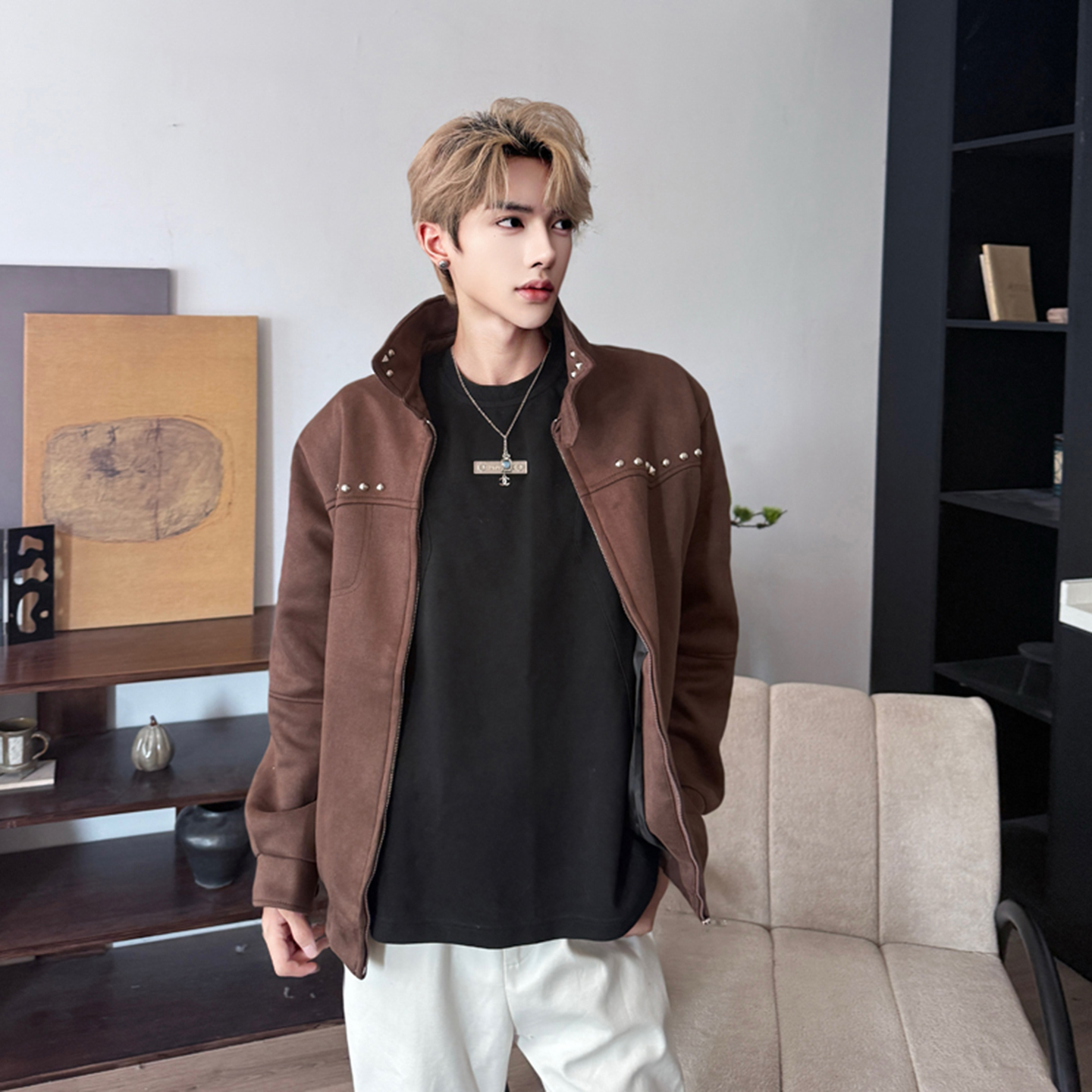 穿搭设计感痞帅铆钉廓形外套 飞行夹克男生秋季 美式 复古麂皮绒短款