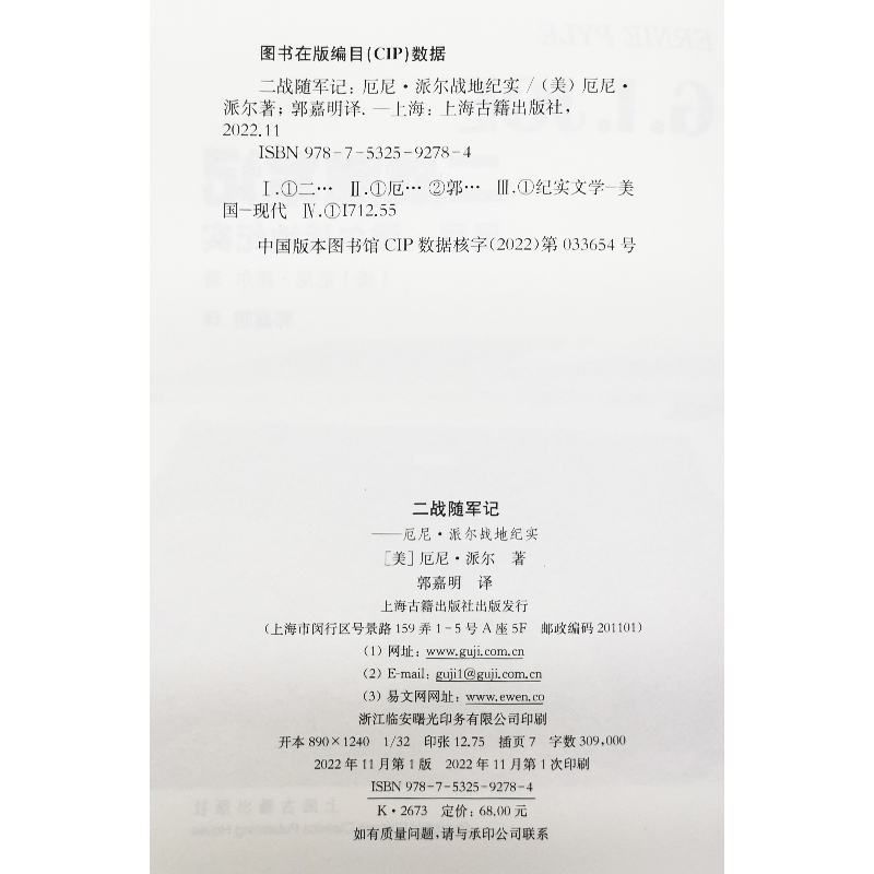 厄尼·派尔战地纪实 上海古籍出版 美 9787532592784 社 厄尼·派尔 二战随军记