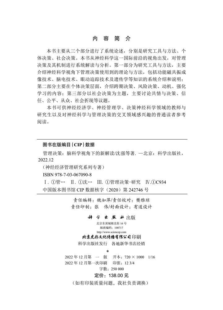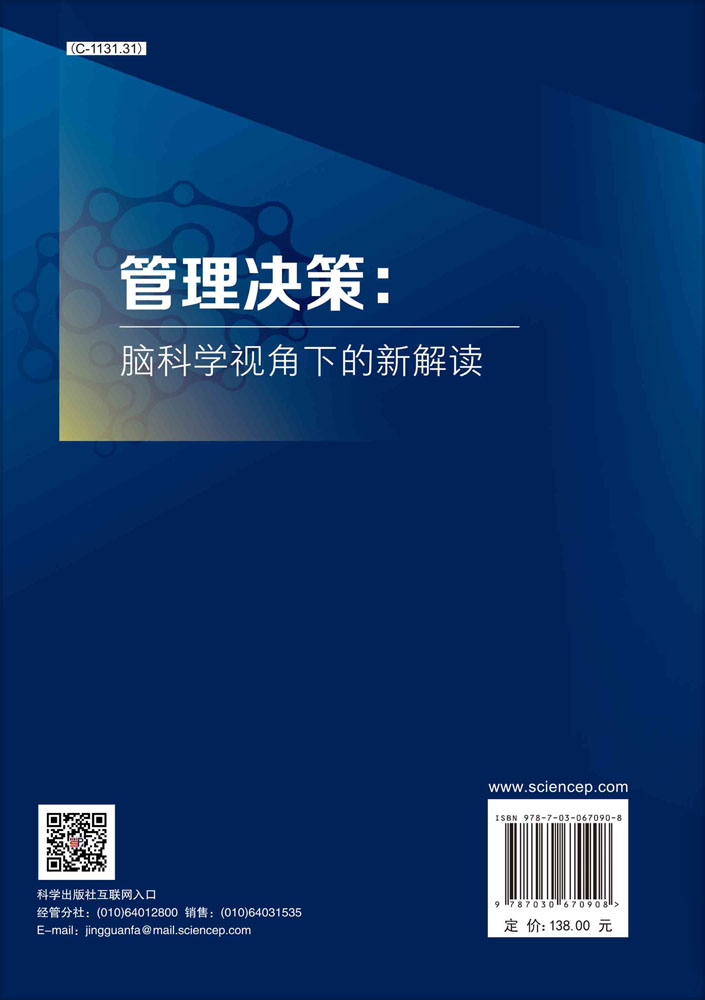 沈强等 新解读 科学 龙门书局出版 9787030670908 现货正版 社 管理决策:脑科学视角下