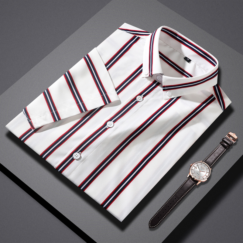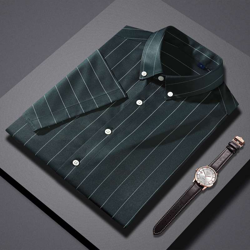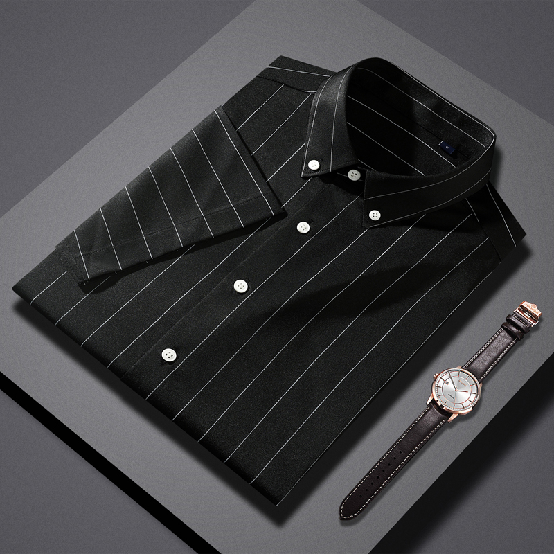 男士 条纹白衬衫 冰丝薄款 衬衣潮流商务休闲弹力寸衣衫 夏季 修身 短袖