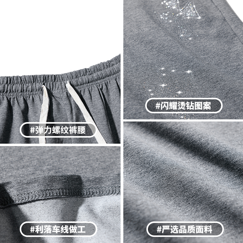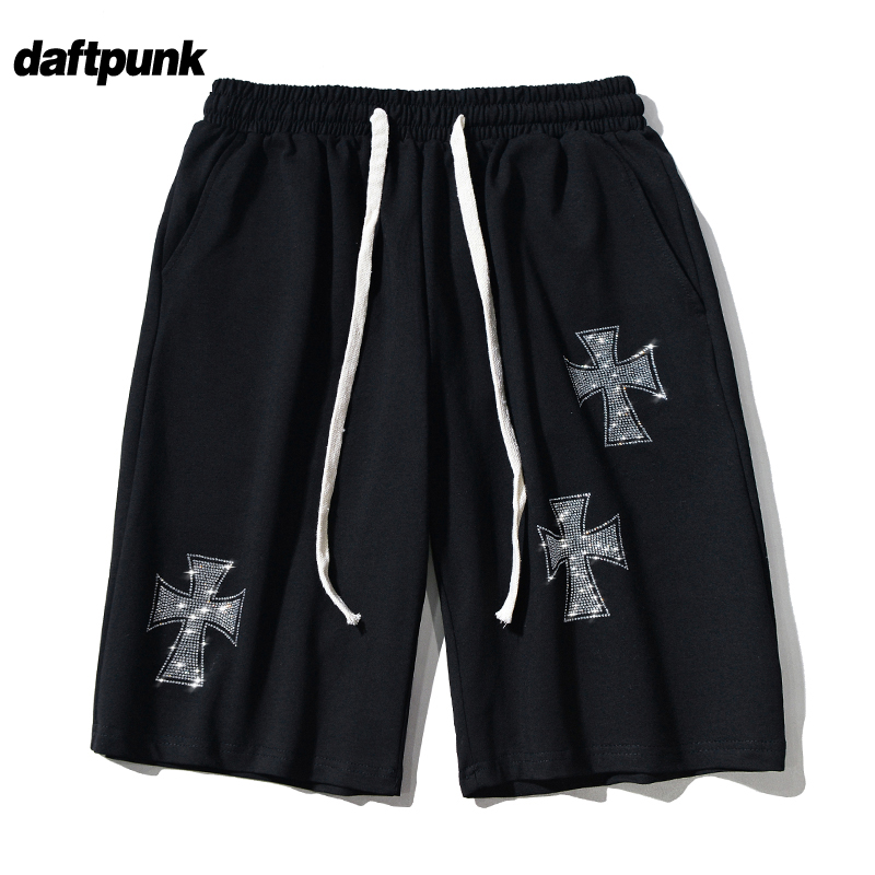 街头复古vintage十字架烫钻运动短裤 潮 男女ins高街暗黑宽松五分裤