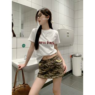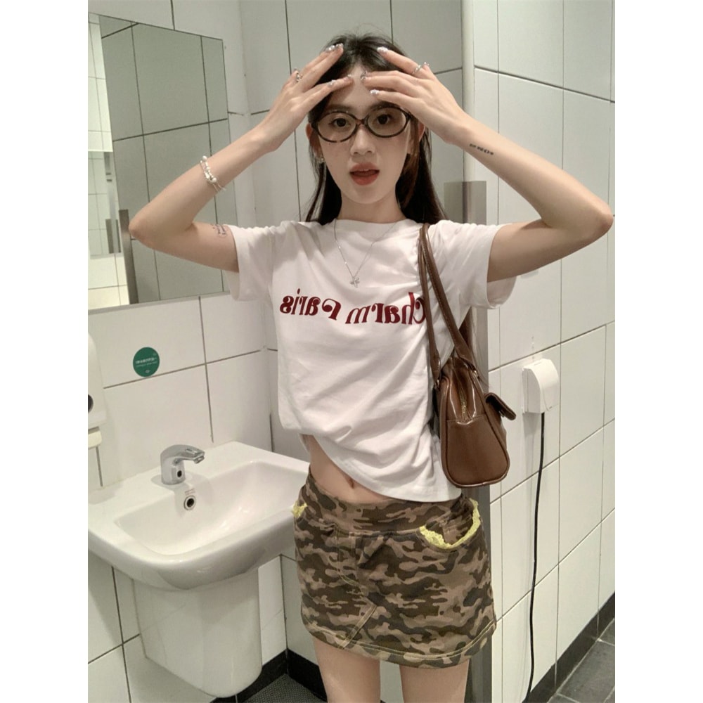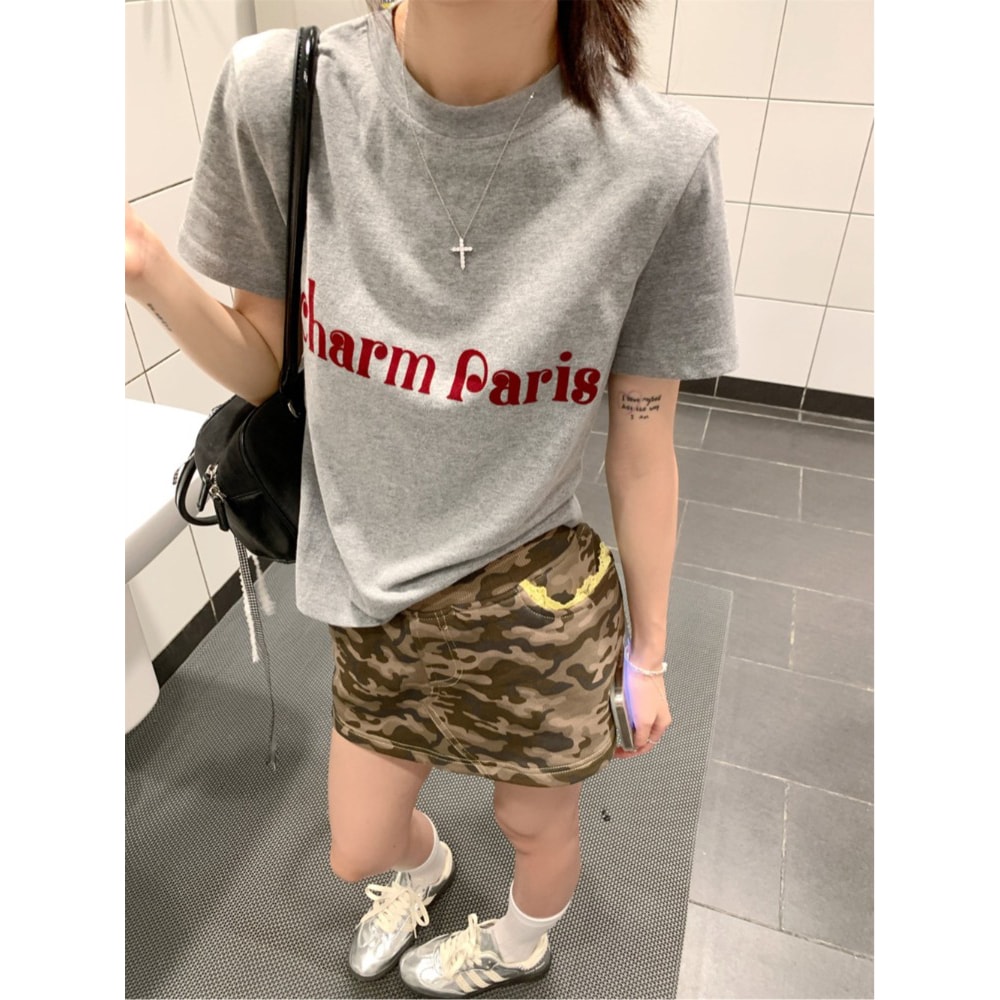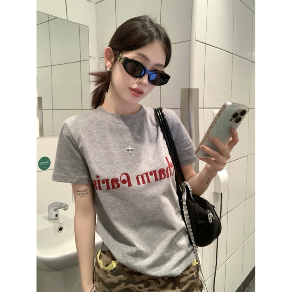 显瘦百搭短袖 设计感小众修身 上衣 复古灰色圆领正肩女t恤夏季 美式