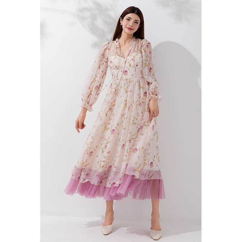 气质海边拼接连身裙 初春长裙法式 美妃连衣裙女装 裙子2024春夏新款