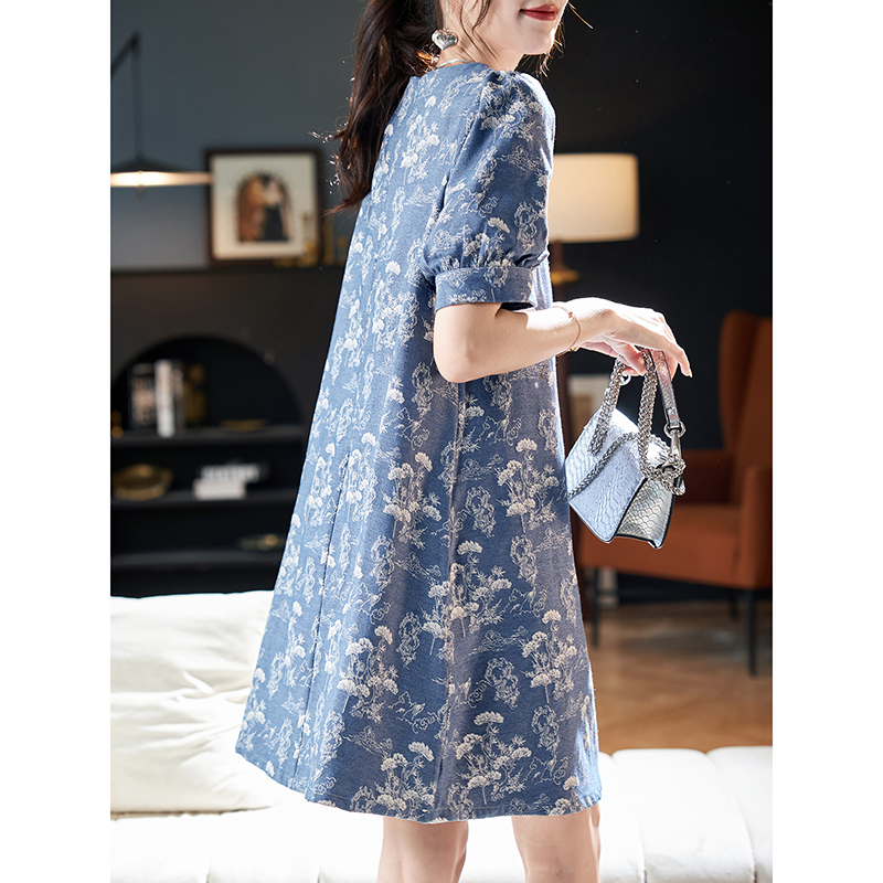 气质国风A字宽松中长休闲裙 连衣裙2025夏季 宝诗黎泡泡袖 印花短袖