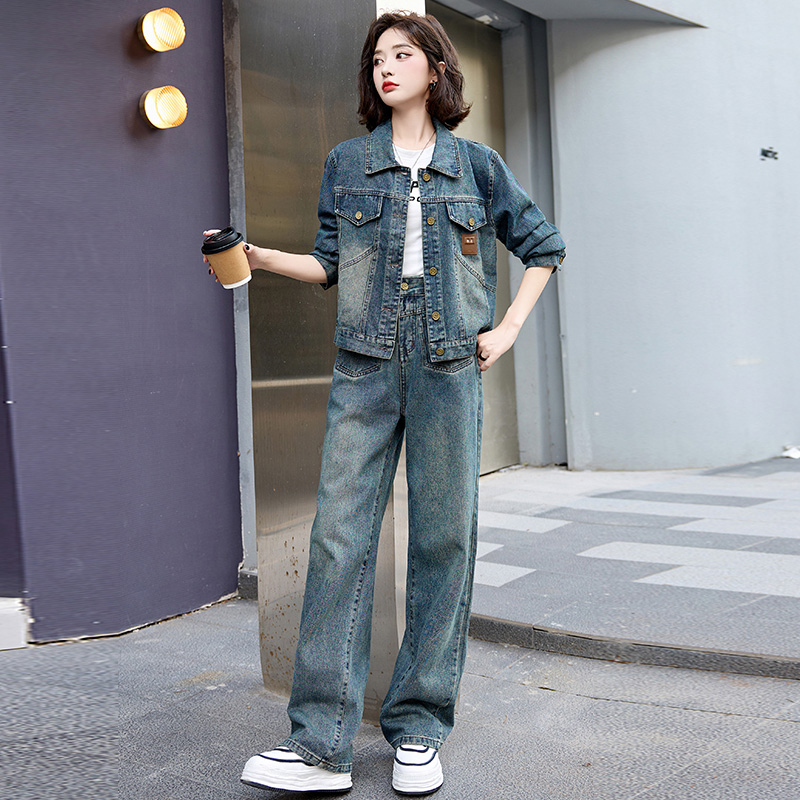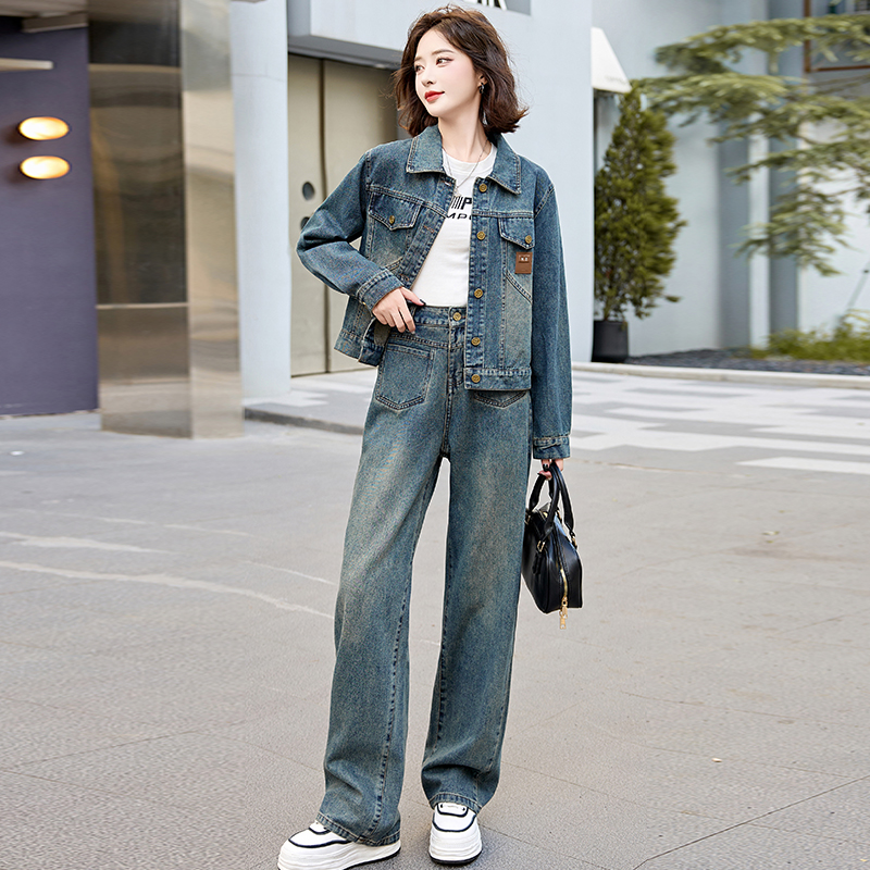 复古时髦牛仔穿搭套装 减龄气质两件套 女外套2024春秋高级感阔腿裤