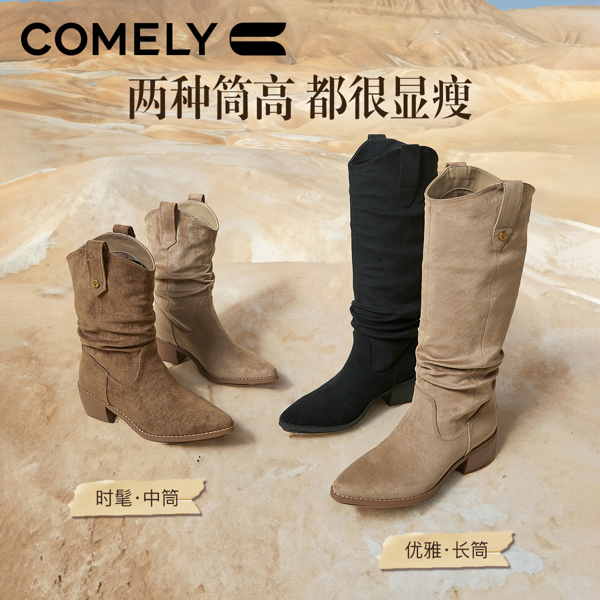 赵露思同款 西部牛仔靴骑士靴民族风短靴 康莉粗跟堆堆靴女24冬新款