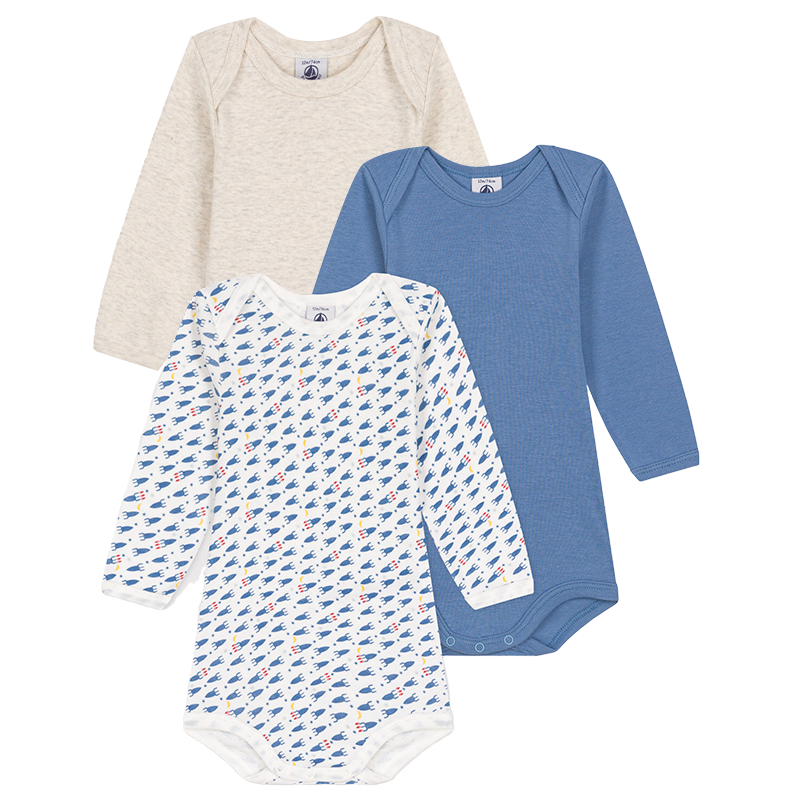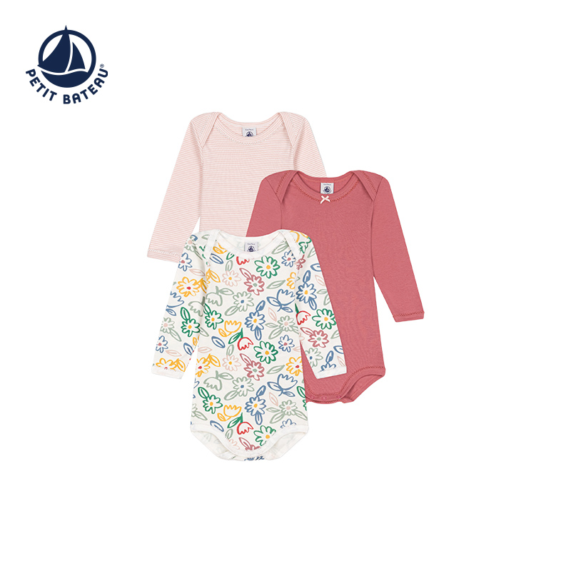 法国Petitbateau小帆船春夏婴幼儿长袖 A0BE6 爬服包屁衣3件装