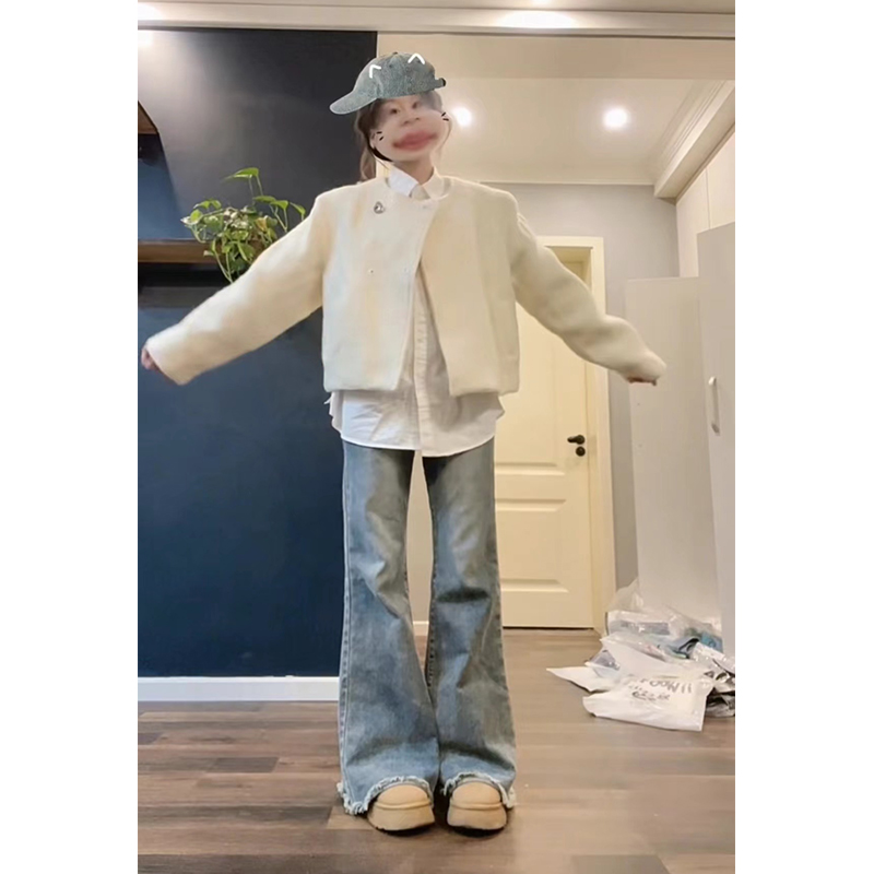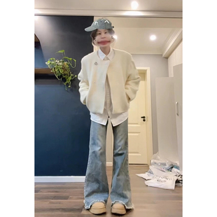 显瘦高腰毛边宽松阔腿裤 女春秋2024新款 复古直筒微喇叭牛仔裤 美式