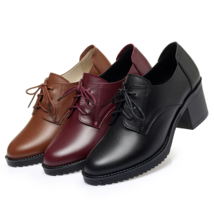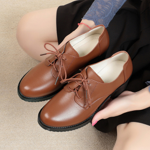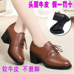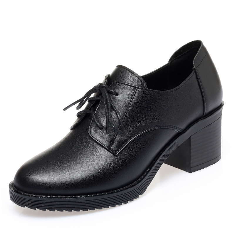 秋冬妈妈工作鞋 黑色小皮鞋 系带真皮软底粗跟单鞋 子中跟高跟鞋 女鞋