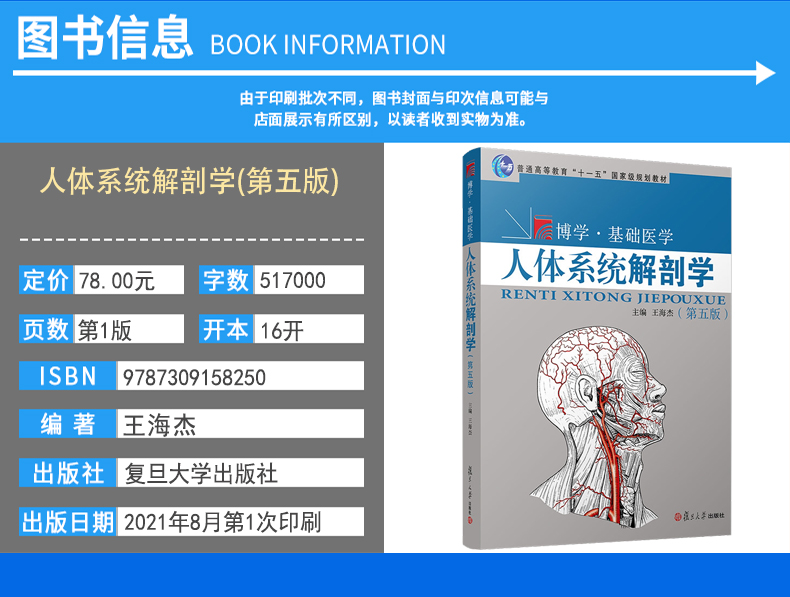 社王海杰主编 人体系统解剖学 复旦大学出版 第5版 人体解剖学系统医学人体器官9787309158250 第五版