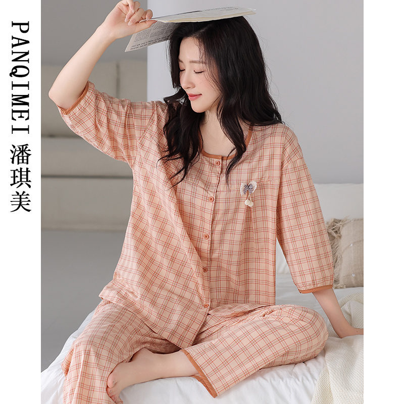 开衫 梭织棉纱布睡衣女夏季 长裤 春季 格子凉感舒适家居服 纯棉七分袖