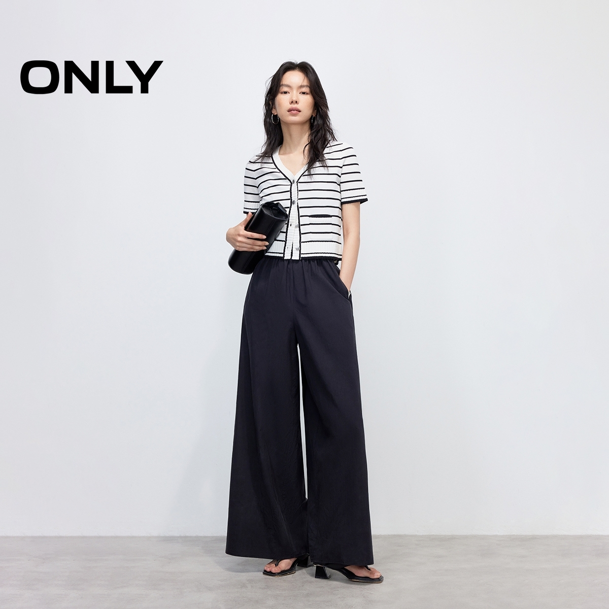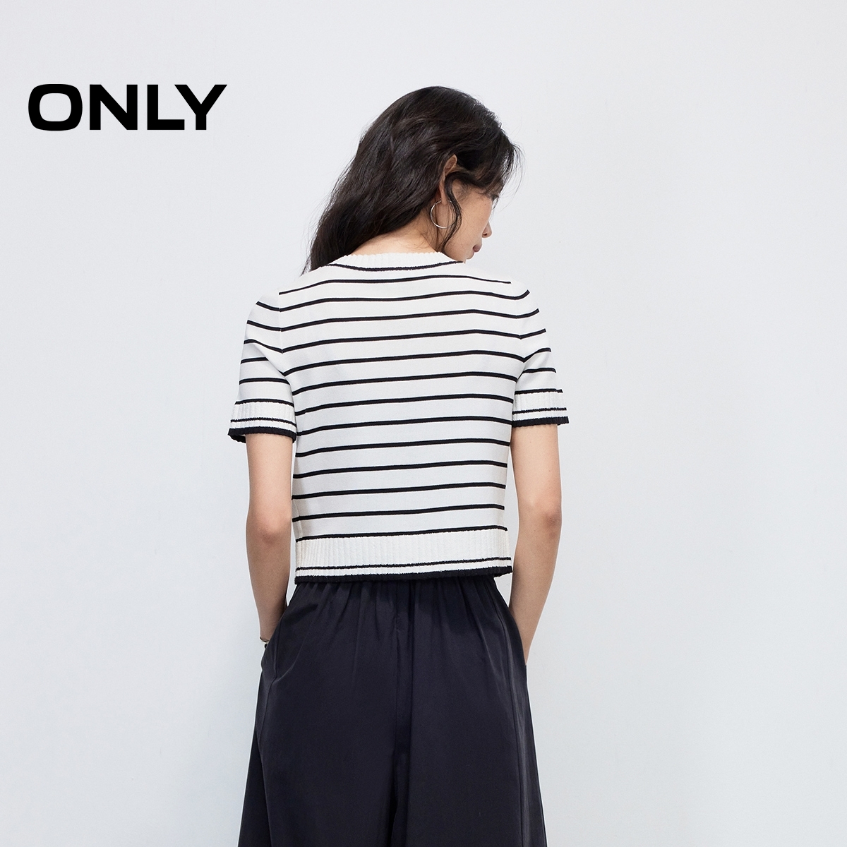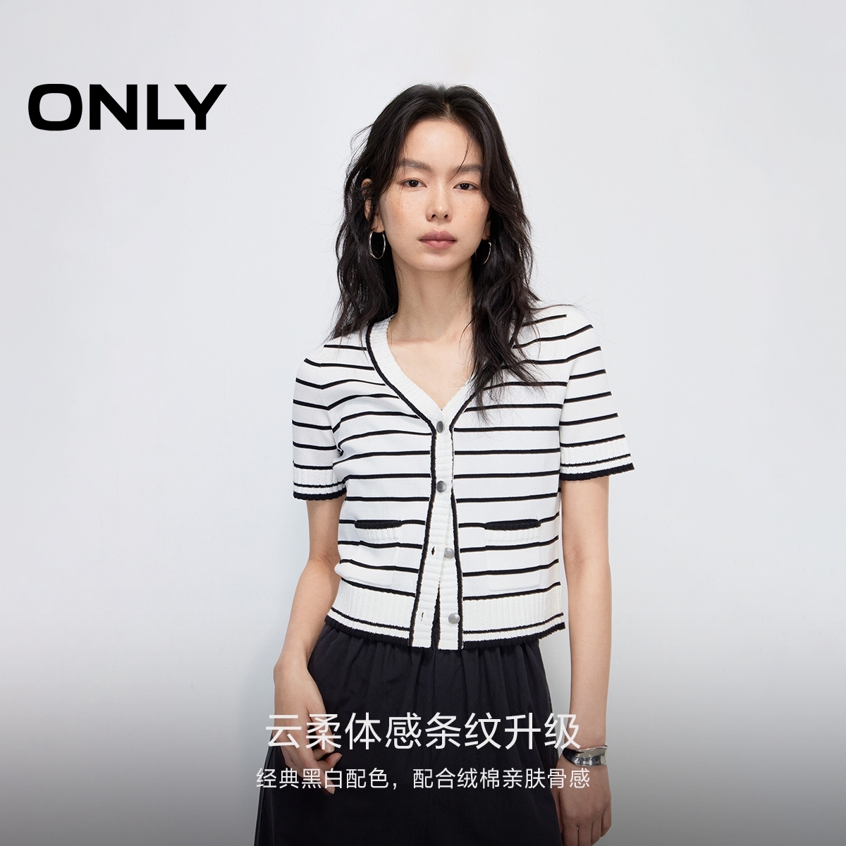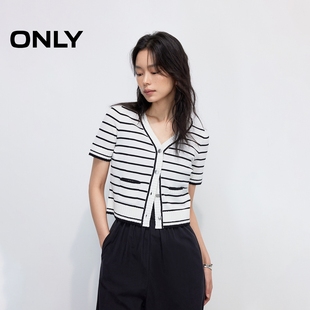 新款 针织衫 亲肤舒适经典 短款 女 黑白条纹显瘦V领短袖 ONLY2025夏季