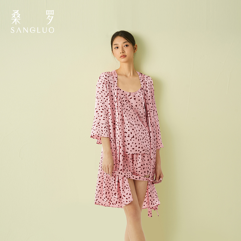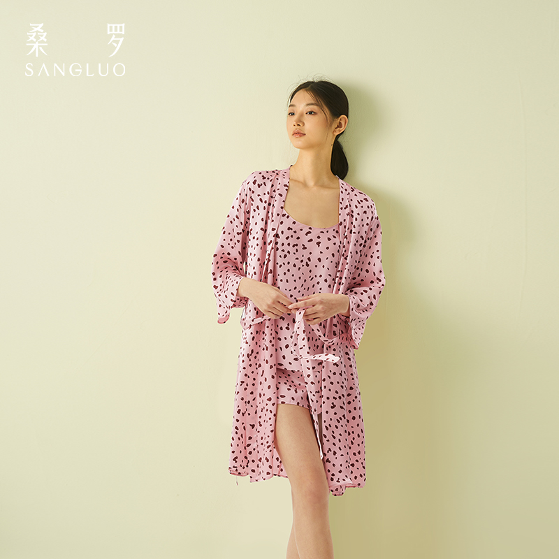 粉色豹纹 桑罗真丝睡袍复古性感约会晨袍100%桑蚕丝家居服新款