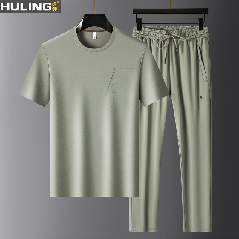 薄款 冰丝夏季 圆领短袖 T恤中年爸爸装 两件套 男士 长裤 休闲运动套装