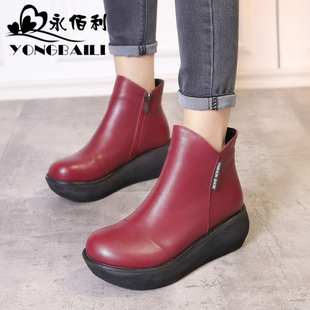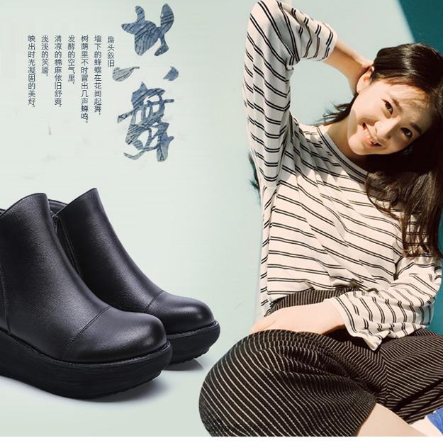 周雨彤推荐 百丽黑桃少女靴厚底马丁靴真皮加绒短靴子B8K1DDD4预