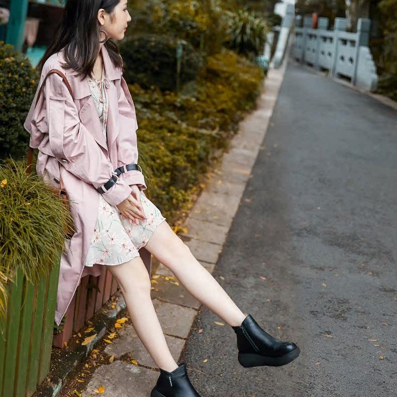 黑色增高靴子女时尚 新款 休闲皮面短靴 2025秋季 环球厚底马丁靴女款