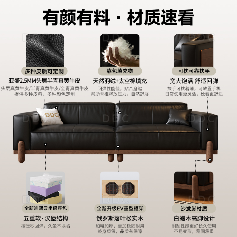 DDC中古风实木真皮沙发头层牛皮客厅新中式 黑色沙发政府补贴 新款