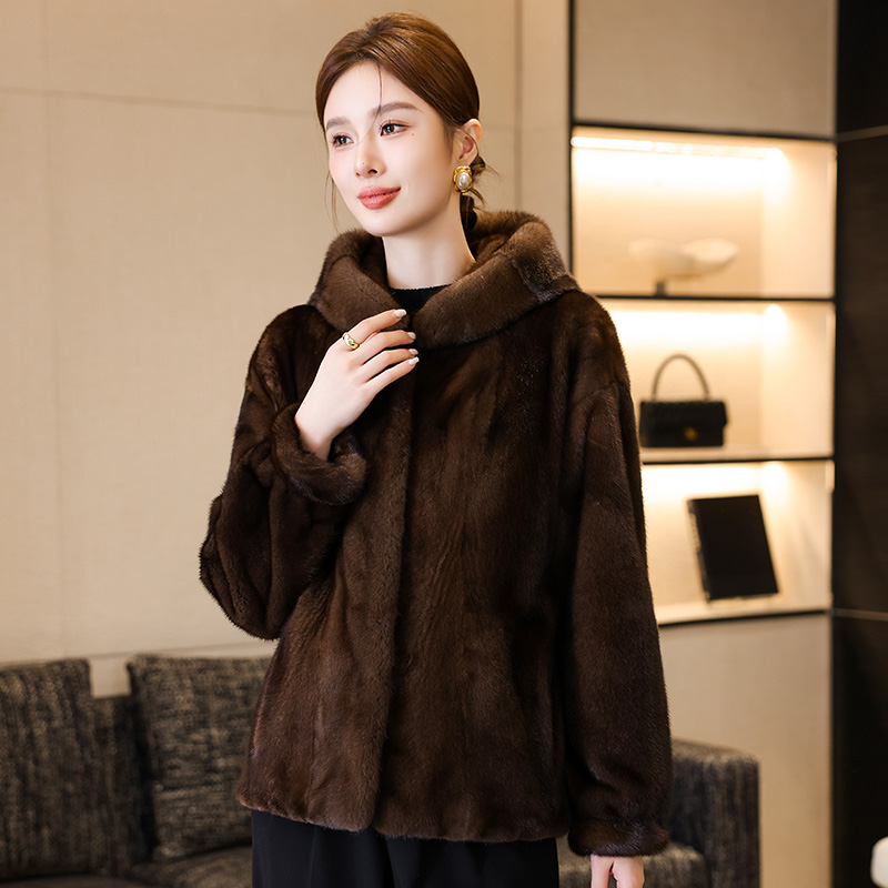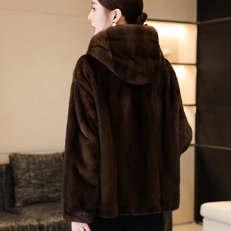水貂毛皮一体草外套女整貂裘皮时尚 连帽年轻天鹅绒貂皮大衣短款
