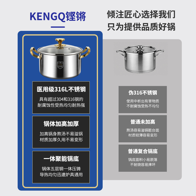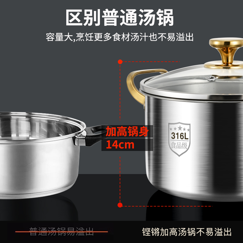 特厚无涂层316L不锈钢加深汤锅家用燃气电磁炉蒸煮炖锅双耳高汤锅
