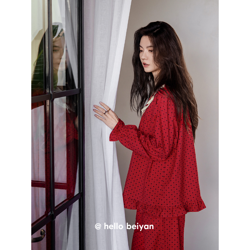 本命年红色套装 家居服大码 V领柔软棉长袖 贝妍新婚睡衣女春秋新款