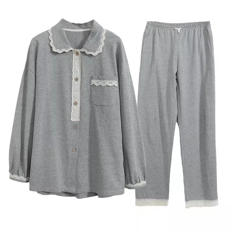 春秋季 大码 家居服套装 纯棉女蕾丝花边翻领长袖 胖mm200斤 睡衣睡裤