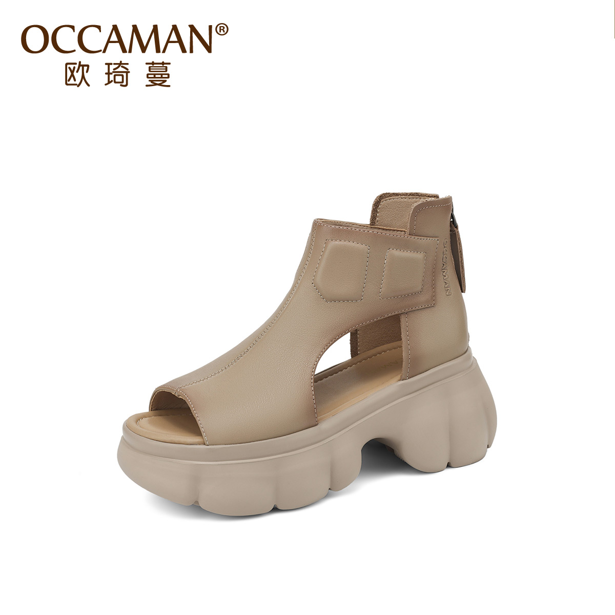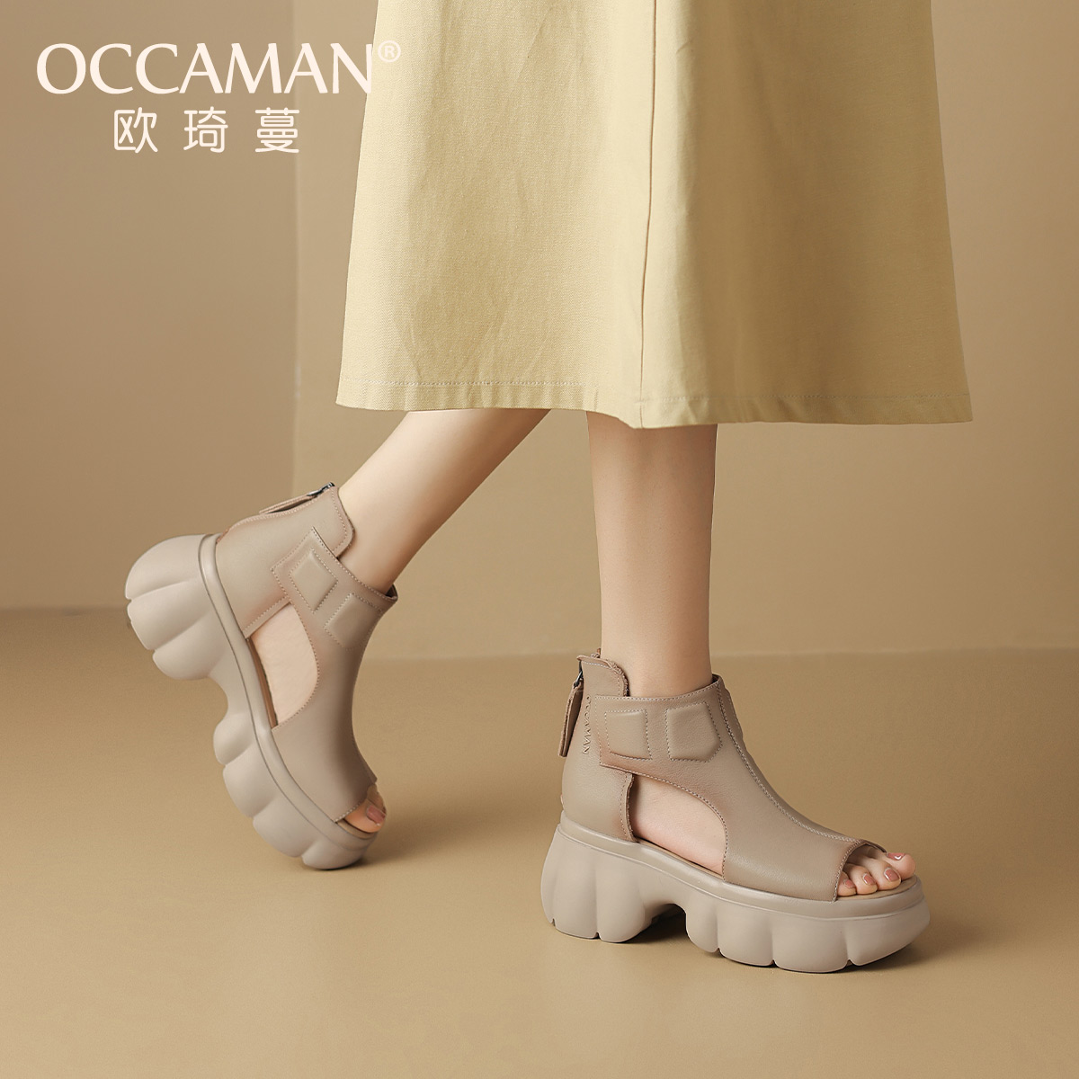 松糕厚底复古增高拖鞋 OCCAMAN 新款 女2025夏季 欧琦蔓真皮罗马凉鞋